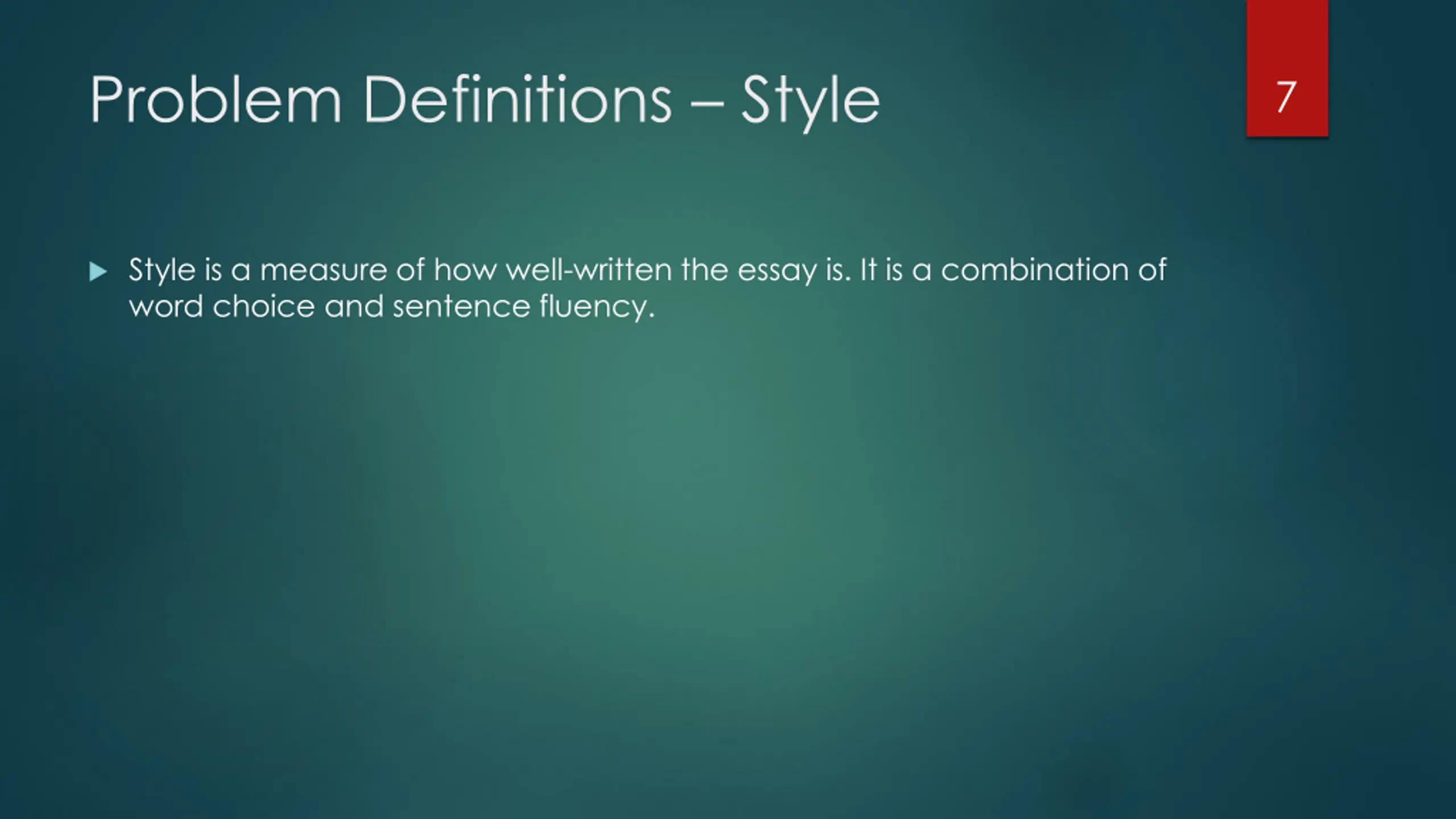 Problem Definitions Style 7 Style is a measure of how well-written the essay is. It is a combination of word choice and sentence fluency.