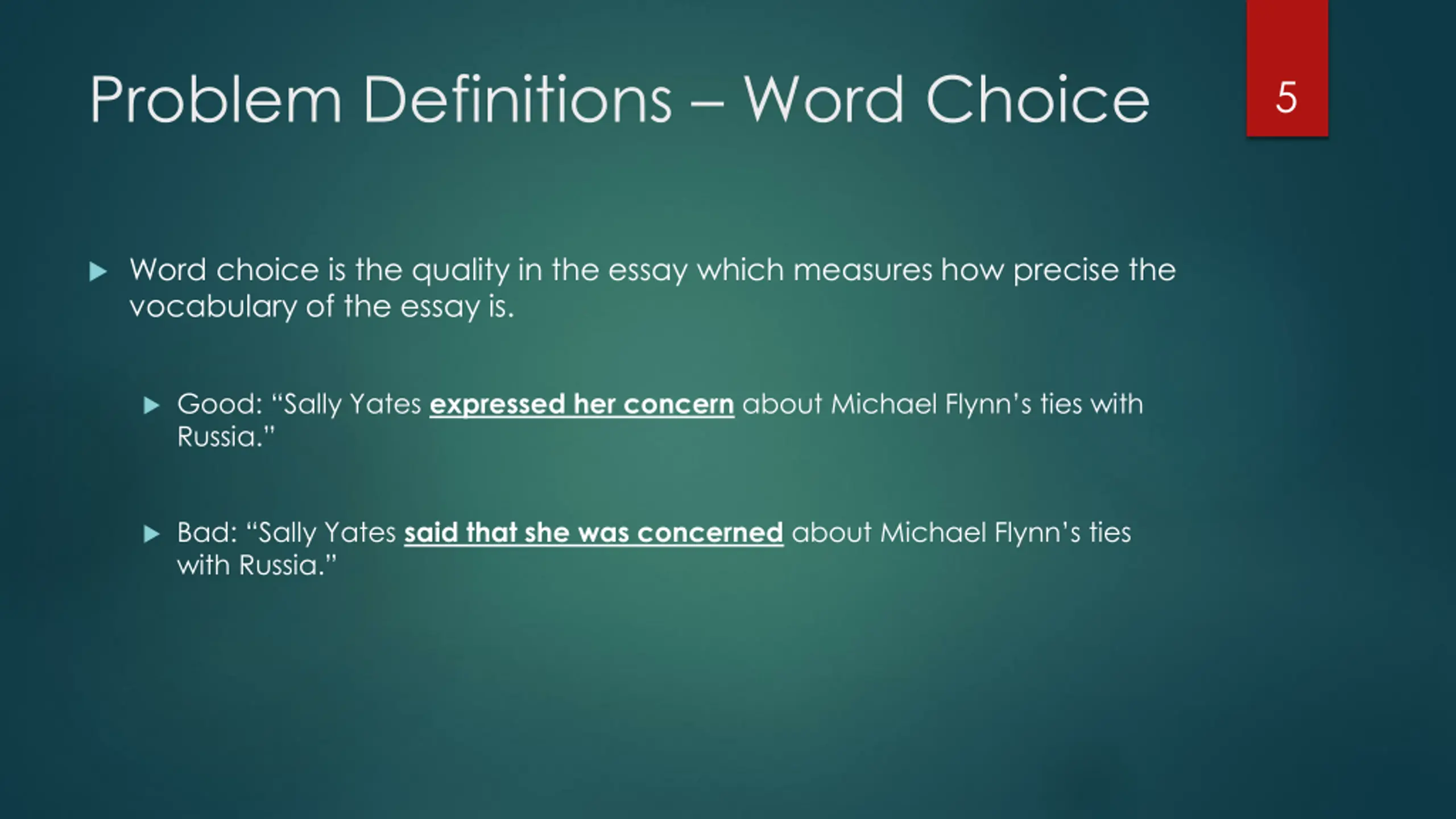 Problem Definitions Word Choice 5 Word choice is the quality in the essay which measures how precise the vocabulary of the essay is. Good: Sally Yates expressed her concernabout Michael Flynn s ties with Russia. Bad: Sally Yates said that she was concernedabout Michael Flynn s ties with Russia.
