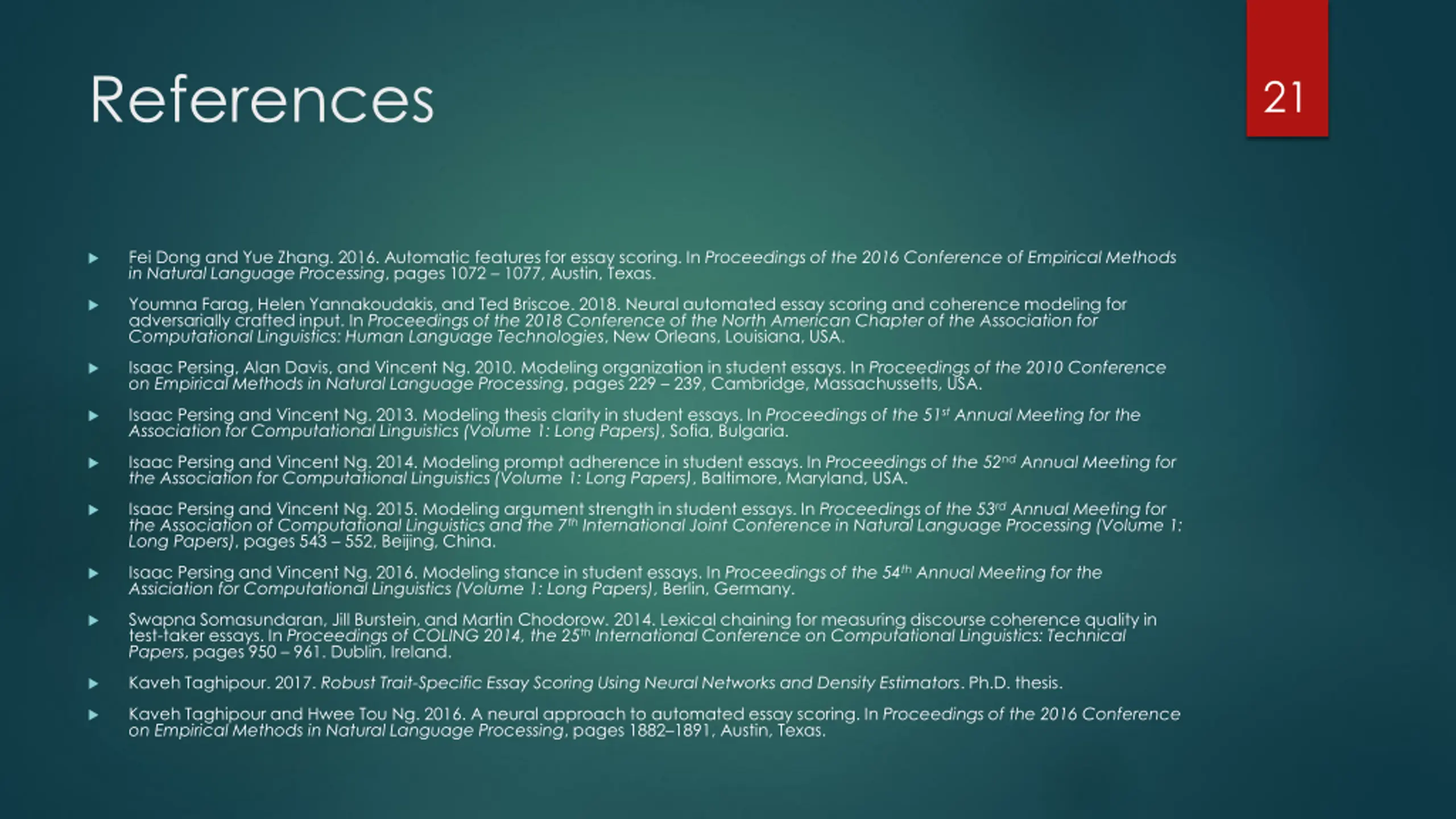 References 21 Fei Dong and Yue Zhang. 2016. Automatic features for essay scoring. In Proceedings of the 2016 Conference of Empirical Methods in Natural Language Processing, pages 1072 1077, Austin, Texas. Youmna Farag, Helen Yannakoudakis, and Ted Briscoe. 2018. Neural automated essay scoring and coherence modeling for adversarially crafted input. In Proceedings of the 2018 Conference of the North American Chapter of the Association for Computational Linguistics: Human Language Technologies, New Orleans, Louisiana, USA. Isaac Persing, Alan Davis, and Vincent Ng. 2010. Modeling organization in student essays. In Proceedings of the 2010 Conference on Empirical Methods in Natural Language Processing, pages 229 239, Cambridge, Massachussetts, USA. Isaac Persing and Vincent Ng. 2013. Modeling thesis clarity in student essays. In Proceedings of the 51st Annual Meeting for the Association for Computational Linguistics (Volume 1: Long Papers), Sofia, Bulgaria. Isaac Persing and Vincent Ng. 2014. Modeling prompt adherence in student essays. In Proceedings of the 52nd Annual Meeting for the Association for Computational Linguistics (Volume 1: Long Papers), Baltimore, Maryland, USA. Isaac Persing and Vincent Ng. 2015. Modeling argument strength in student essays. In Proceedings of the 53rd Annual Meeting for the Association of Computational Linguistics and the 7th International Joint Conference in Natural Language Processing (Volume 1: Long Papers), pages 543 552, Beijing, China. Isaac Persing and Vincent Ng. 2016. Modeling stance in student essays. In Proceedings of the 54th Annual Meeting for the Assiciation for Computational Linguistics (Volume 1: Long Papers), Berlin, Germany. Swapna Somasundaran, Jill Burstein, and Martin Chodorow. 2014. Lexical chaining for measuring discourse coherence quality in test-taker essays. In Proceedings of COLING 2014, the 25th International Conference on Computational Linguistics: Technical Papers, pages 950 961. Dublin, Ireland. Kaveh Taghipour. 2017. Robust Trait-Specific Essay Scoring Using Neural Networks and Density Estimators. Ph.D. thesis. Kaveh Taghipour and Hwee Tou Ng. 2016. A neural approach to automated essay scoring. In Proceedings of the 2016 Conference on Empirical Methods in Natural Language Processing, pages 1882 1891, Austin, Texas.