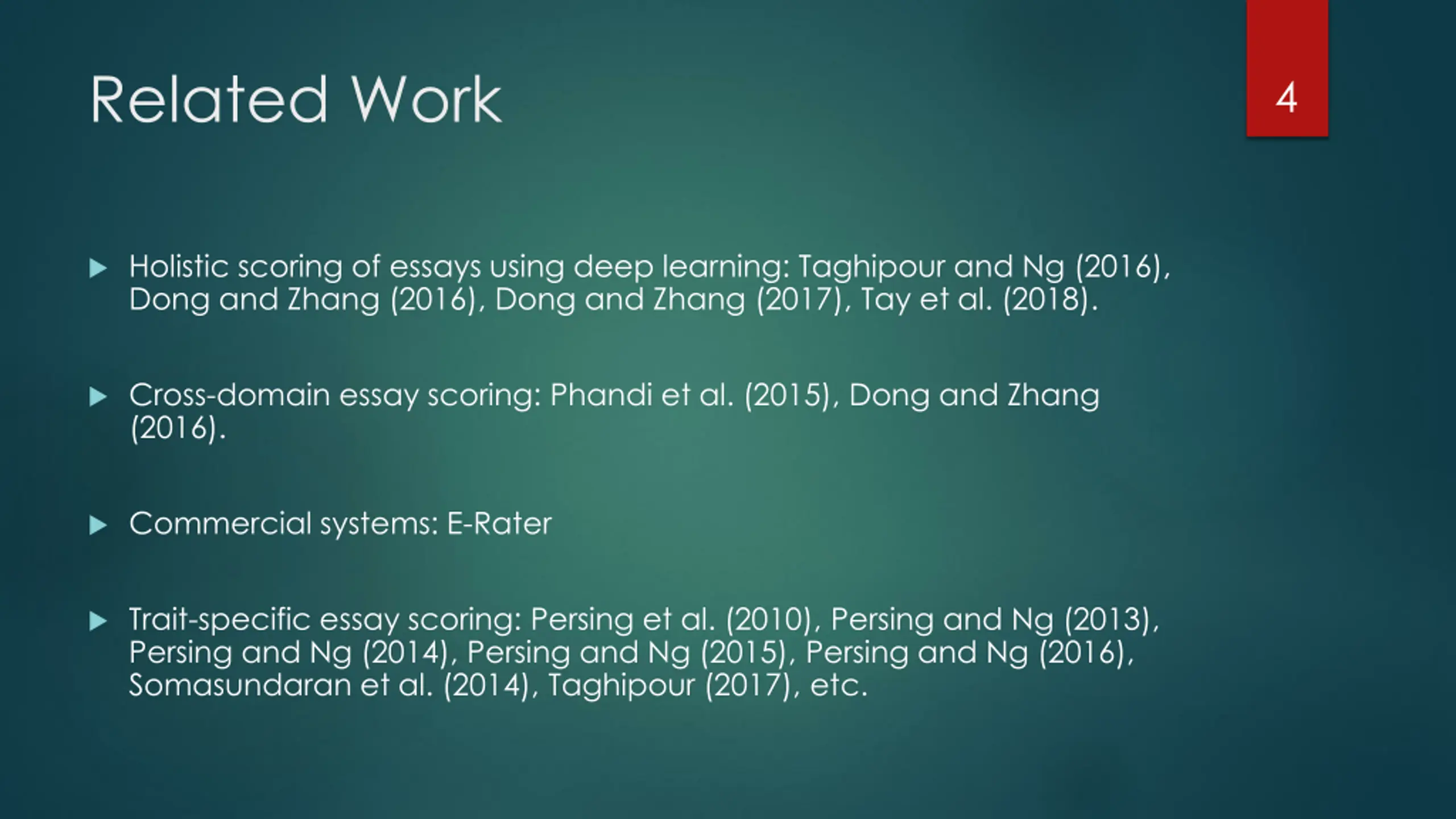Related Work 4 Holistic scoring of essays using deep learning: Taghipour and Ng (2016), Dong and Zhang (2016), Dong and Zhang (2017), Tay et al. (2018). Cross-domain essay scoring: Phandi et al. (2015), Dong and Zhang (2016). Commercial systems: E-Rater Trait-specific essay scoring: Persing et al. (2010), Persing and Ng (2013), Persing and Ng (2014), Persing and Ng (2015), Persing and Ng (2016), Somasundaran et al. (2014), Taghipour (2017), etc.