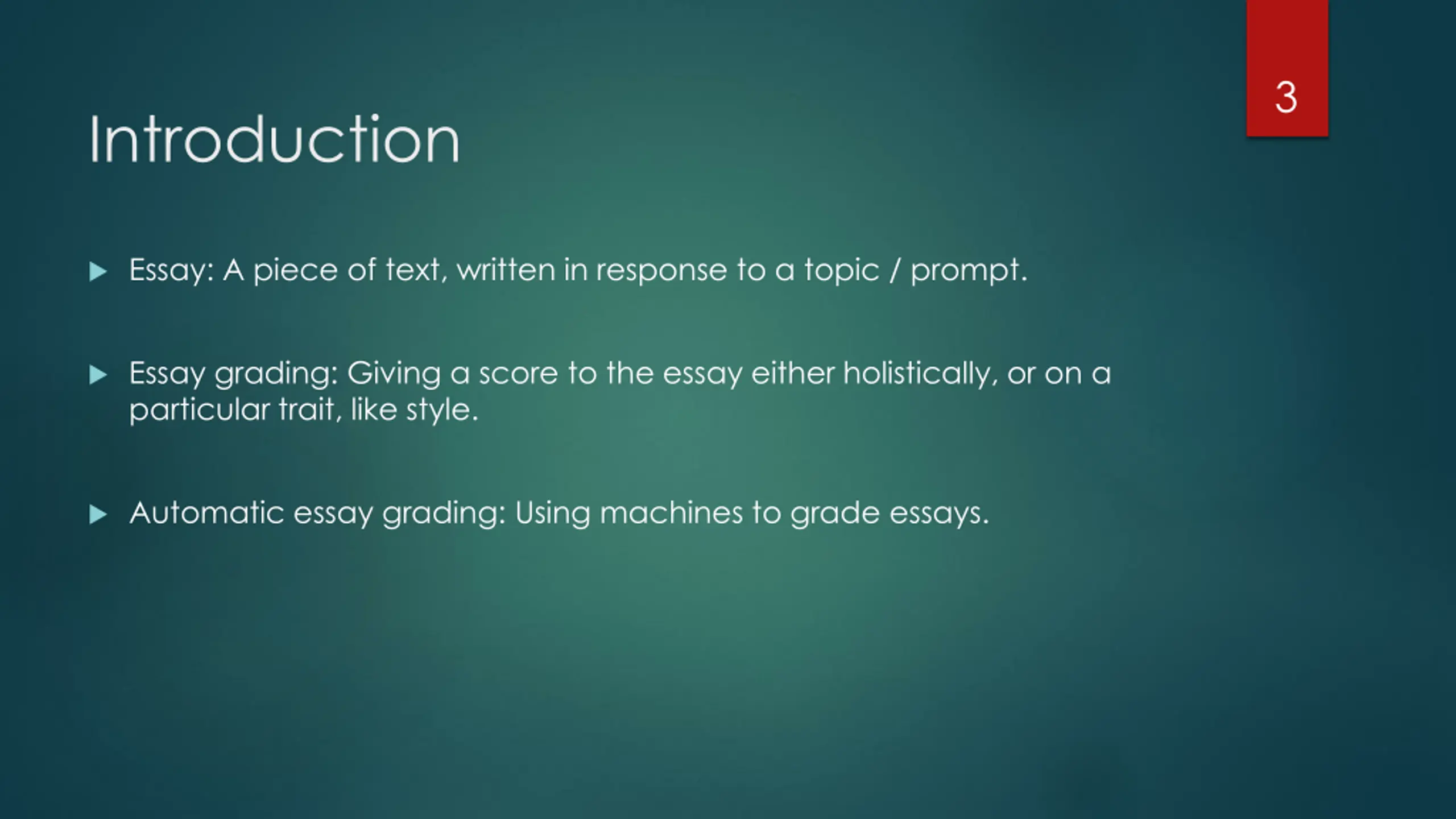 3 Introduction Essay: A piece of text, written in response to a topic / prompt. Essay grading: Giving a score to the essay either holistically, or on a particular trait, like style. Automatic essay grading: Using machines to grade essays.