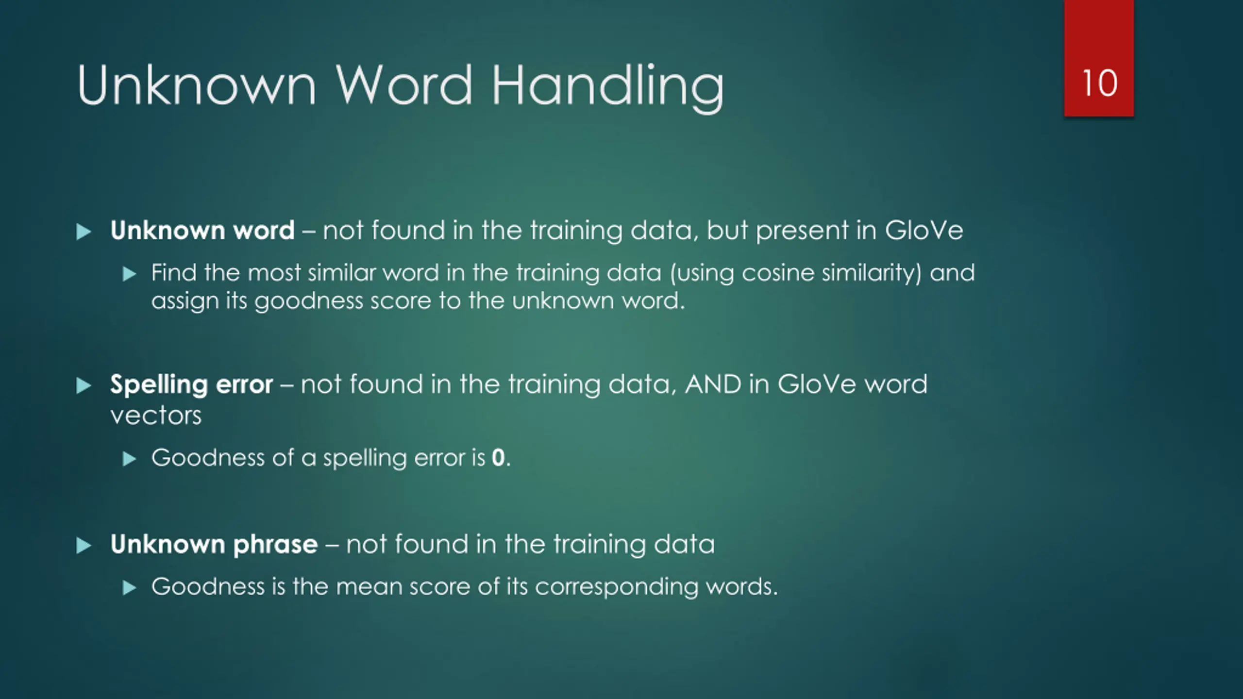 Unknown Word Handling 10 Unknown word not found in the training data, but present in GloVe Find the most similar word in the training data (using cosine similarity) and assign its goodness score to the unknown word. Spelling error not found in the training data, AND in GloVe word vectors Goodness of a spelling error is 0. Unknown phrase not found in the training data Goodness is the mean score of its corresponding words.