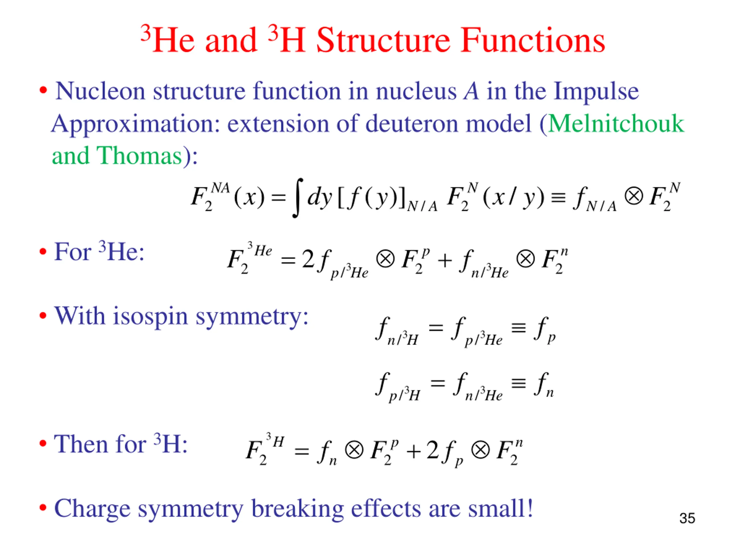 3He and 3H Structure Functions Nucleon structure function in nucleus A in the Impulse Approximation: extension of deuteron model (Melnitchouk and Thomas): f dy x F 2 [ ) ( = NA N N ( )] ( / ) y F x y f F / 2 / 2 N A N A For 3He: 3 = + He p n 2 F f F f F 2 2 2 3 3 / / p He n He With isospin symmetry: = f f f p 3 3 / / n H p He = f f f n 3 3 / / p H n He Then for 3H: 3 = + H p n 2 F f F f F 2 2 2 n p Charge symmetry breaking effects are small! 35