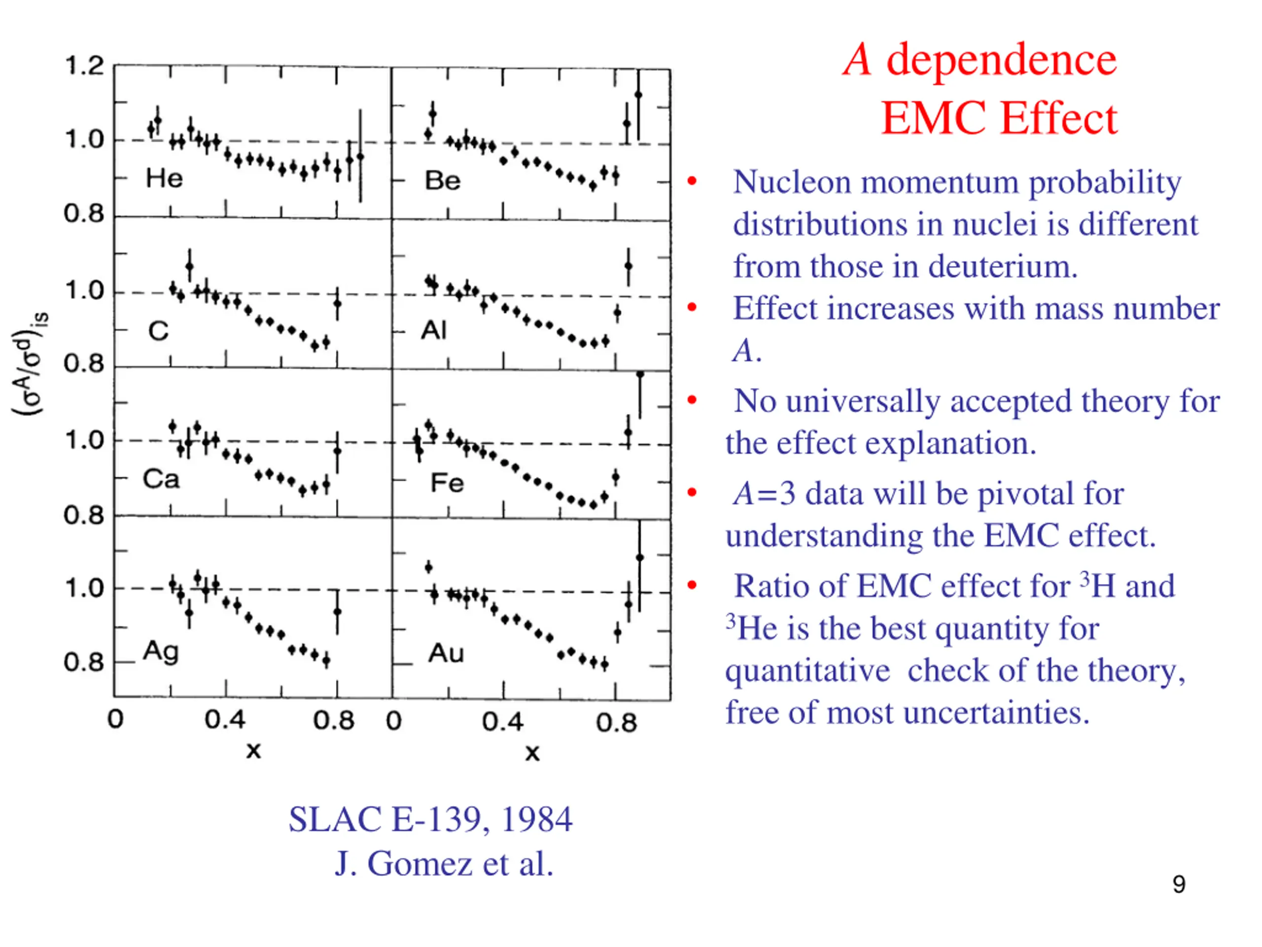 A dependence EMC Effect Nucleon momentum probability distributions in nuclei is different from those in deuterium. Effect increases with mass number A. No universally accepted theory for the effect explanation. A=3 data will be pivotal for understanding the EMC effect. Ratio of EMC effect for 3H and 3He is the best quantity for quantitative check of the theory, free of most uncertainties. SLAC E-139, 1984 J. Gomez et al. 9
