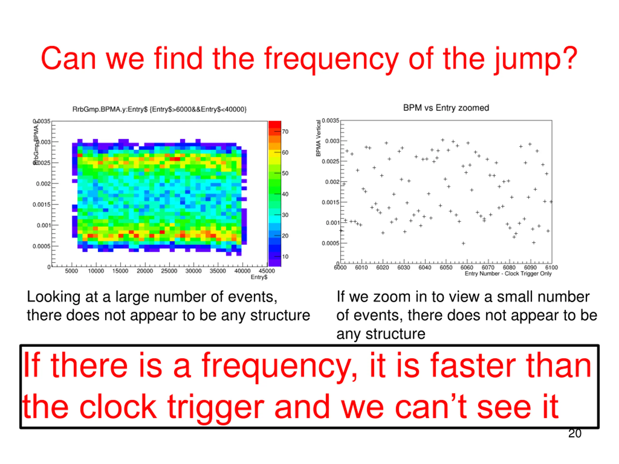 Can we find the frequency of the jump? Looking at a large number of events, there does not appear to be any structure If we zoom in to view a small number of events, we don t see any structure 19