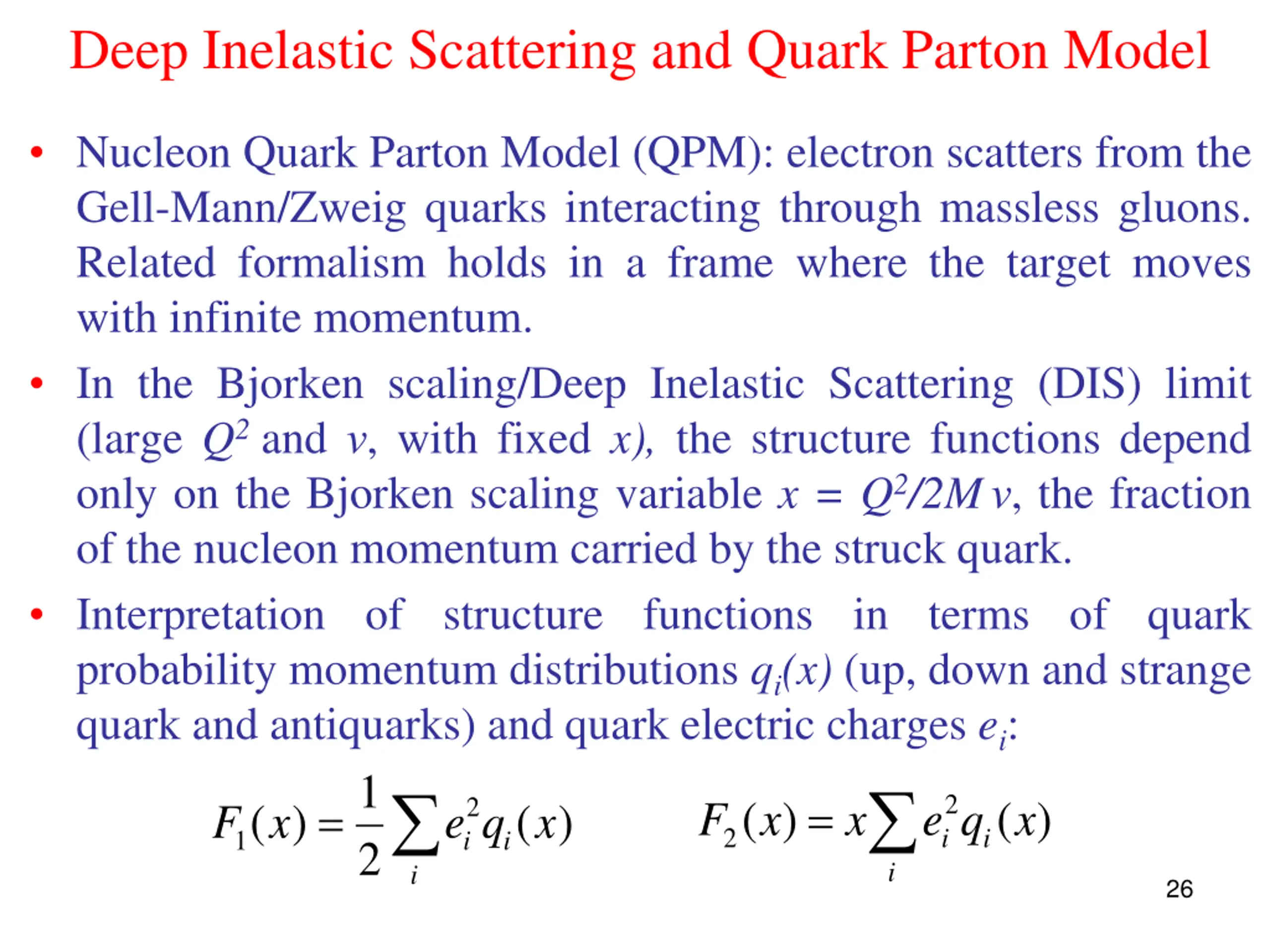 Deep Inelastic Scattering and Quark Parton Model Nucleon Quark Parton Model (QPM): electron scatters from the Gell-Mann/Zweig quarks interacting through massless gluons. Related formalism holds in a frame where the target moves with infinite momentum. In the Bjorken scaling/Deep Inelastic Scattering (DIS) limit (large Q2and , with fixed x), the structure functions depend only on the Bjorken scaling variable x = Q2/2M , the fraction of the nucleon momentum carried by the struck quark. Interpretation of structure functions in terms of quark probability momentum distributions qi(x) (up, down and strange quark and antiquarks) and quark electric charges ei: 1 ) ( 1 x q e x F i i = 2 i = 2 i ( ) ( ) F x x e q x ( ) 2 i 2 i 26