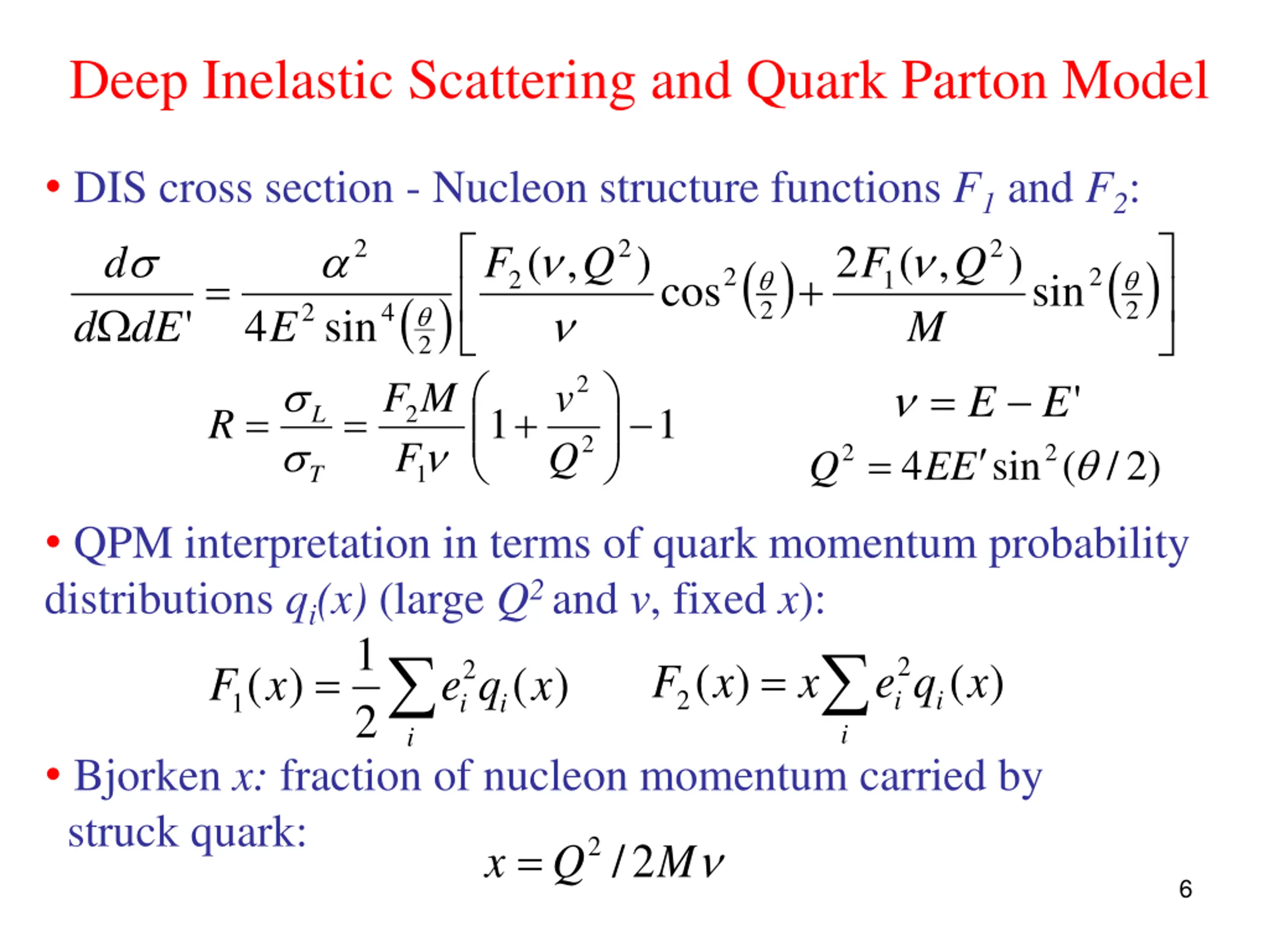 Deep Inelastic Scattering and Quark Parton Model DIS cross section - Nucleon structure functions F1 and F2: = 2 sin 4 ' E dE d 2 2 Q F T d ( ( M 2 2 2 , ) 2 , ) F Q F Q ( ) 2 ( ) + 2 2 cos sin 2 1 ( ) M F 2 2 4 = E v ' E = = + 1 1 R L 2 = 2 2 4 sin ( ) 2 / Q E E 1 QPM interpretation in terms of quark momentum probability distributions qi(x) (large Q2and , fixed x): 1 ) ( 1 x q e x F i i = 2 i = 2 i ( ) ( ) F x x e q x ( ) 2 i 2 i Bjorken x: fraction of nucleon momentum carried by struck quark: x = 2 / 2 Q M 6