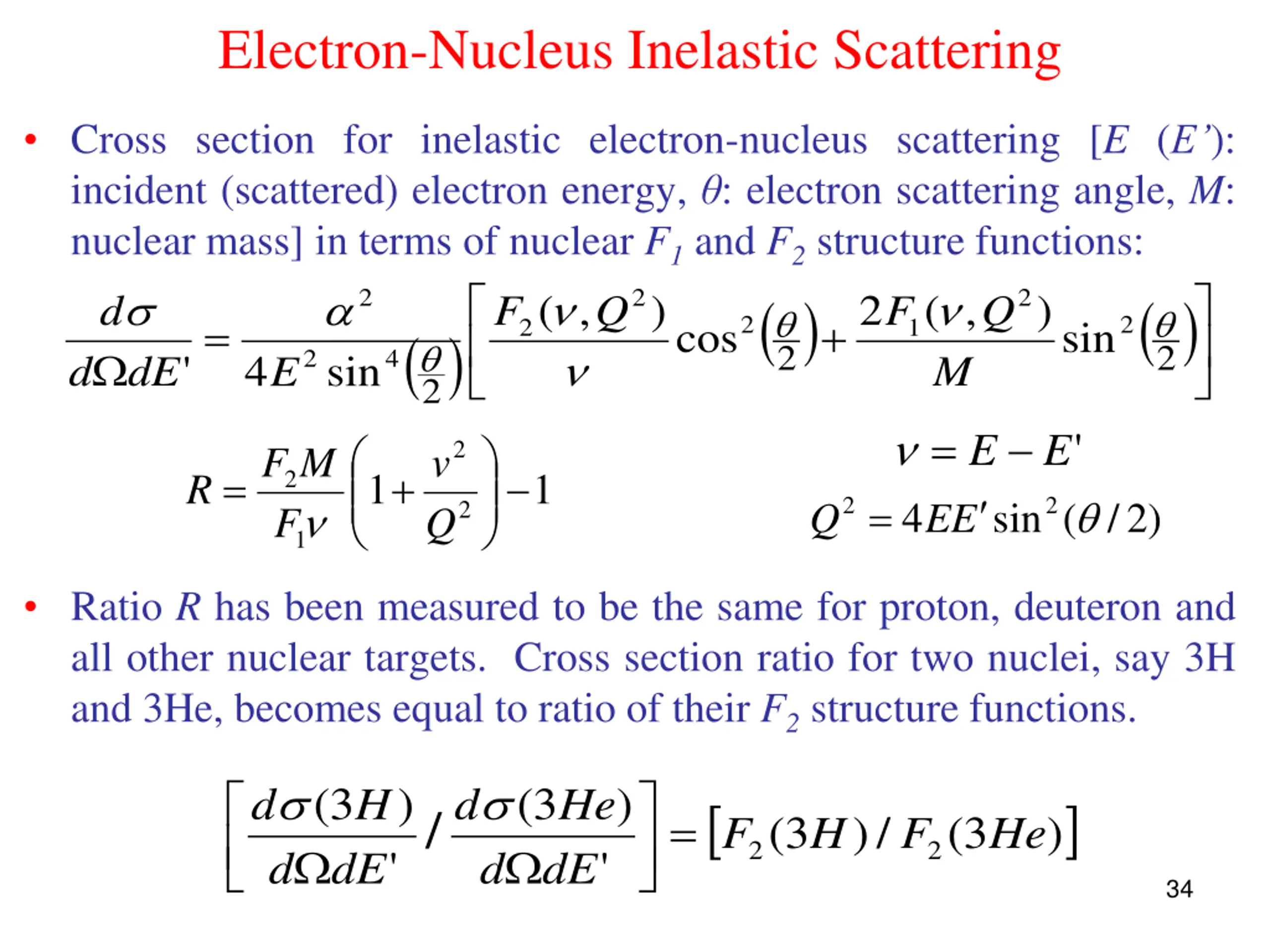 Electron-Nucleus Inelastic Scattering Cross section for inelastic electron-nucleus scattering [E (E ): incident (scattered) electron energy, : electron scattering angle, M: nuclear mass] in terms of nuclear F1 and F2 structure functions: = 2 sin 4 ' E dE d Q F ( ) 2 ( ) d ( ( M 2 2 2 , ) 2 , ) F Q F Q + 2 2 cos sin 2 1 ( ) 2 2 4 4 = E sin E E = ' E 2 F M v = + 1 1 2 R 2 2 ( ) 2 / Q 2 1 Ratio R has been measured to be the same for proton, deuteron and all other nuclear targets. Cross section ratio for two nuclei, say 3H and 3He, becomes equal to ratio of their F2 structure functions. 3 ( ) 3 ( ) d H d He ) / = 3 ( 2 F / ) 3 ( 2 F H He ' ' d dE d dE 34