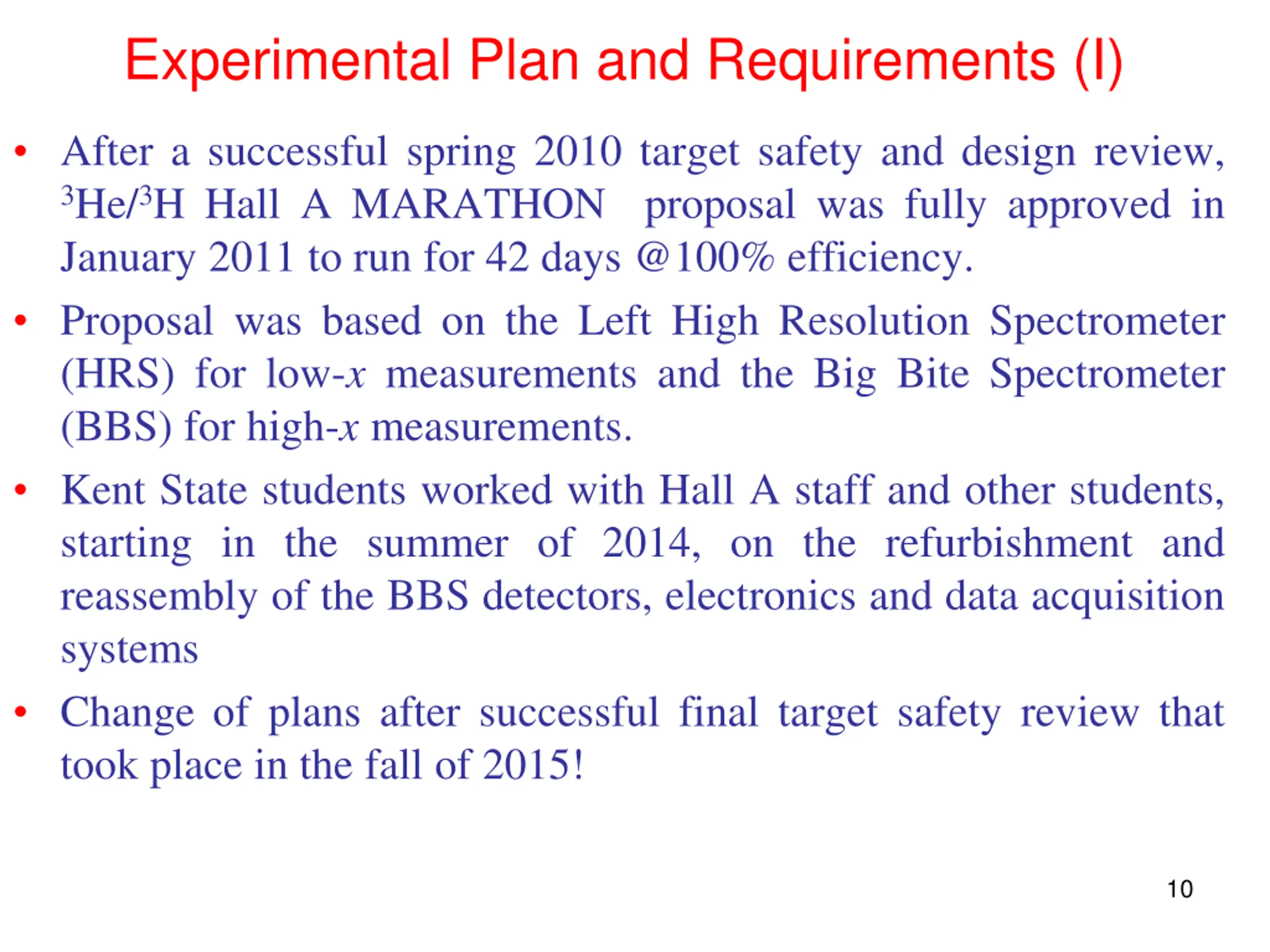 Experimental Plan and Requirements (I) After a successful spring 2010 target safety and design review, 3He/3H Hall A MARATHON proposal was fully approved in January 2011 to run for 42 days @100% efficiency. Proposal was based on the Left High Resolution Spectrometer (HRS) for low-x measurements and the Big Bite Spectrometer (BBS) for high-x measurements. Kent State students worked with Hall A staff and other students, starting in the summer of 2014, on the refurbishment and reassembly of the BBS detectors, electronics and data acquisition systems Change of plans after successful final target safety review that took place in the fall of 2015! 10