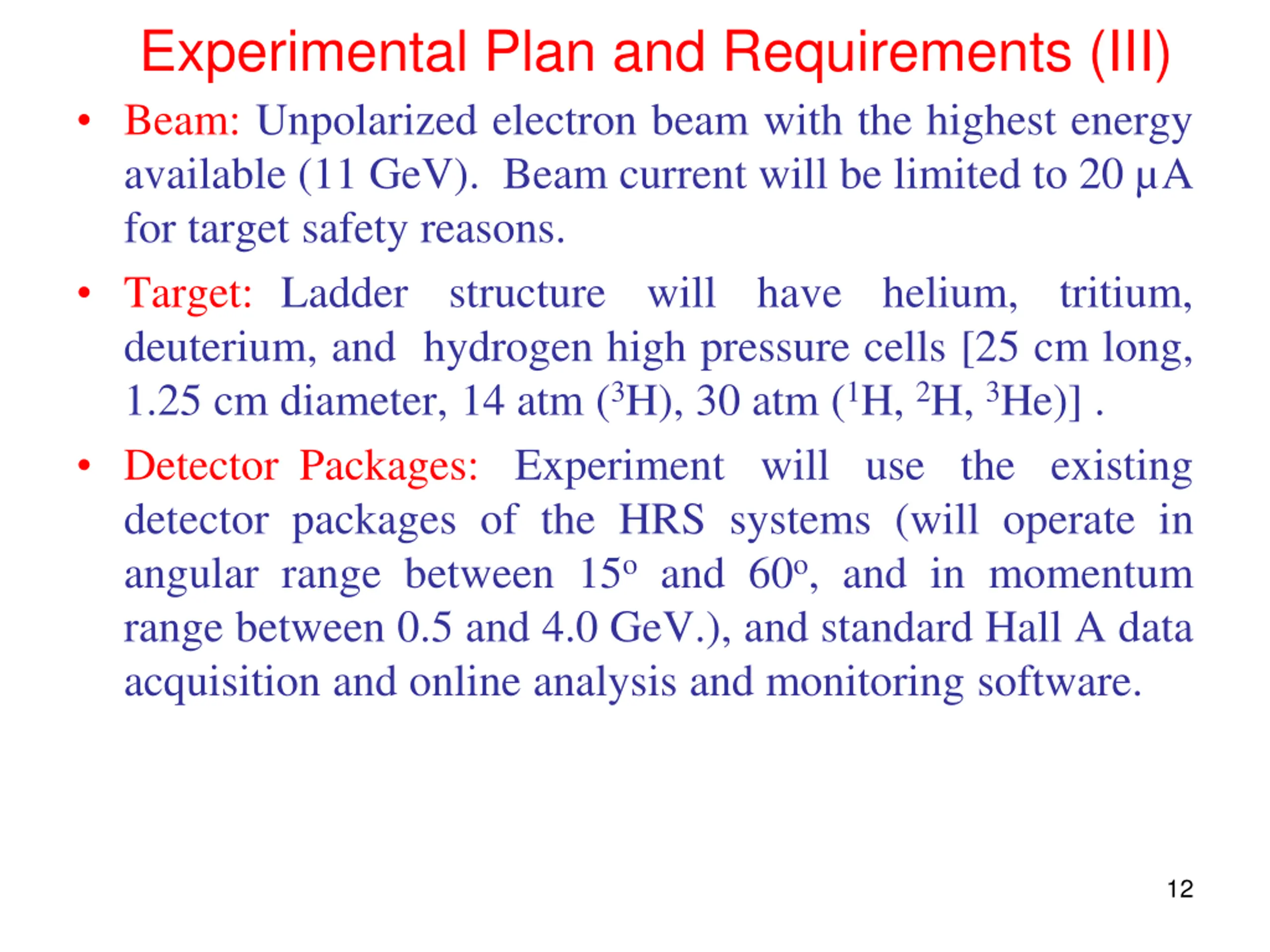 Experimental Plan and Requirements (III) Beam: Unpolarized electron beam with the highest energy available (11 GeV). Beam current will be limited to 20 A for target safety reasons. Target:Ladder structure will have helium, tritium, deuterium, and hydrogen high pressure cells [25 cm long, 1.25 cm diameter, 14 atm (3H), 30 atm (1H, 2H, 3He)] . DetectorPackages: Experiment will use the existing detector packages of the HRS systems (will operate in angular range between 15o and 60o, and in momentum range between 0.5 and 4.0 GeV.), and standard Hall A data acquisition and online analysis and monitoring software. 12