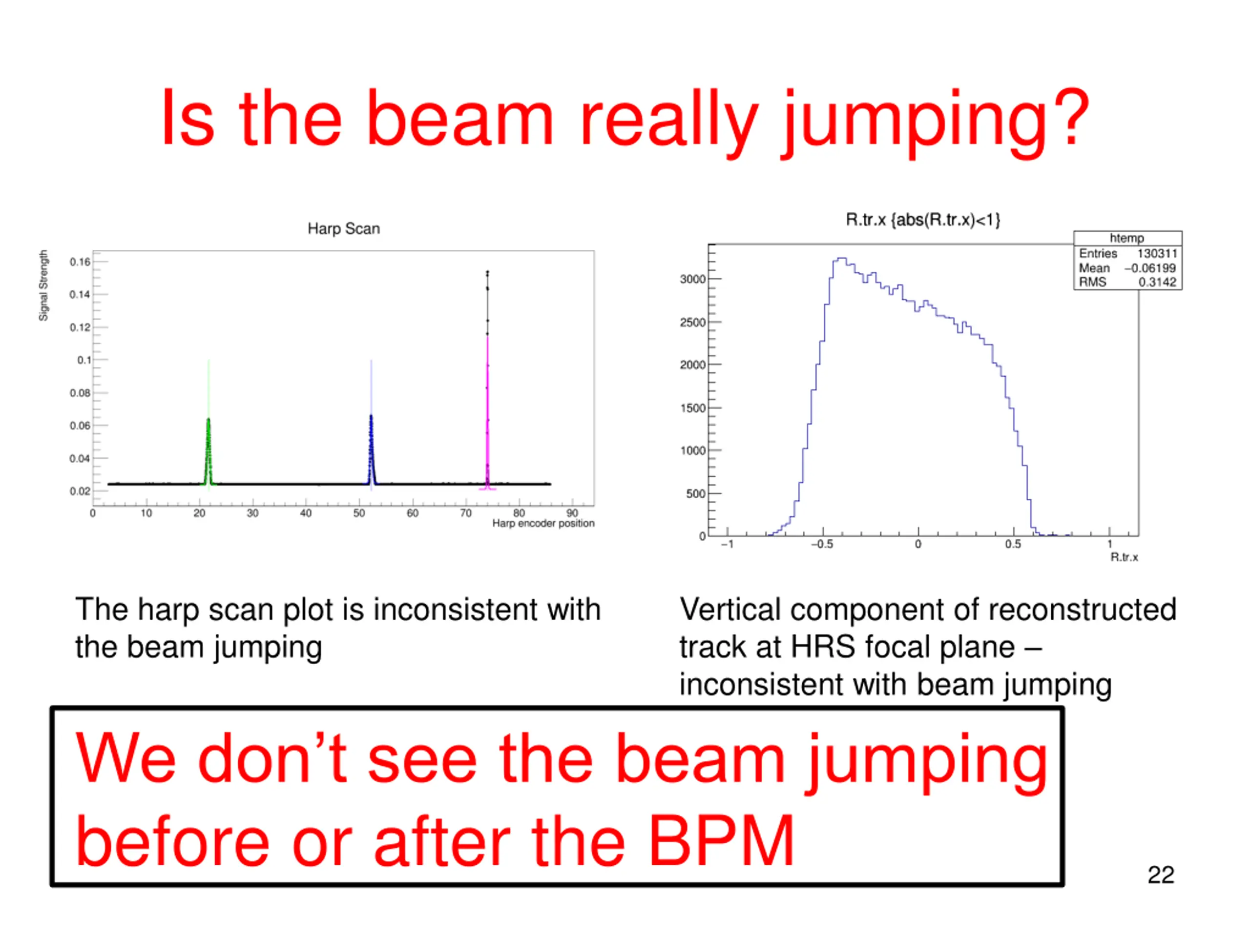 Is the beam really jumping? The harp scan plot is inconsistent with the beam jumping Vertical component of reconstructed track at HRS focal plane inconsistent with beam jumping We don t see the beam jumping before or after the BPM 22