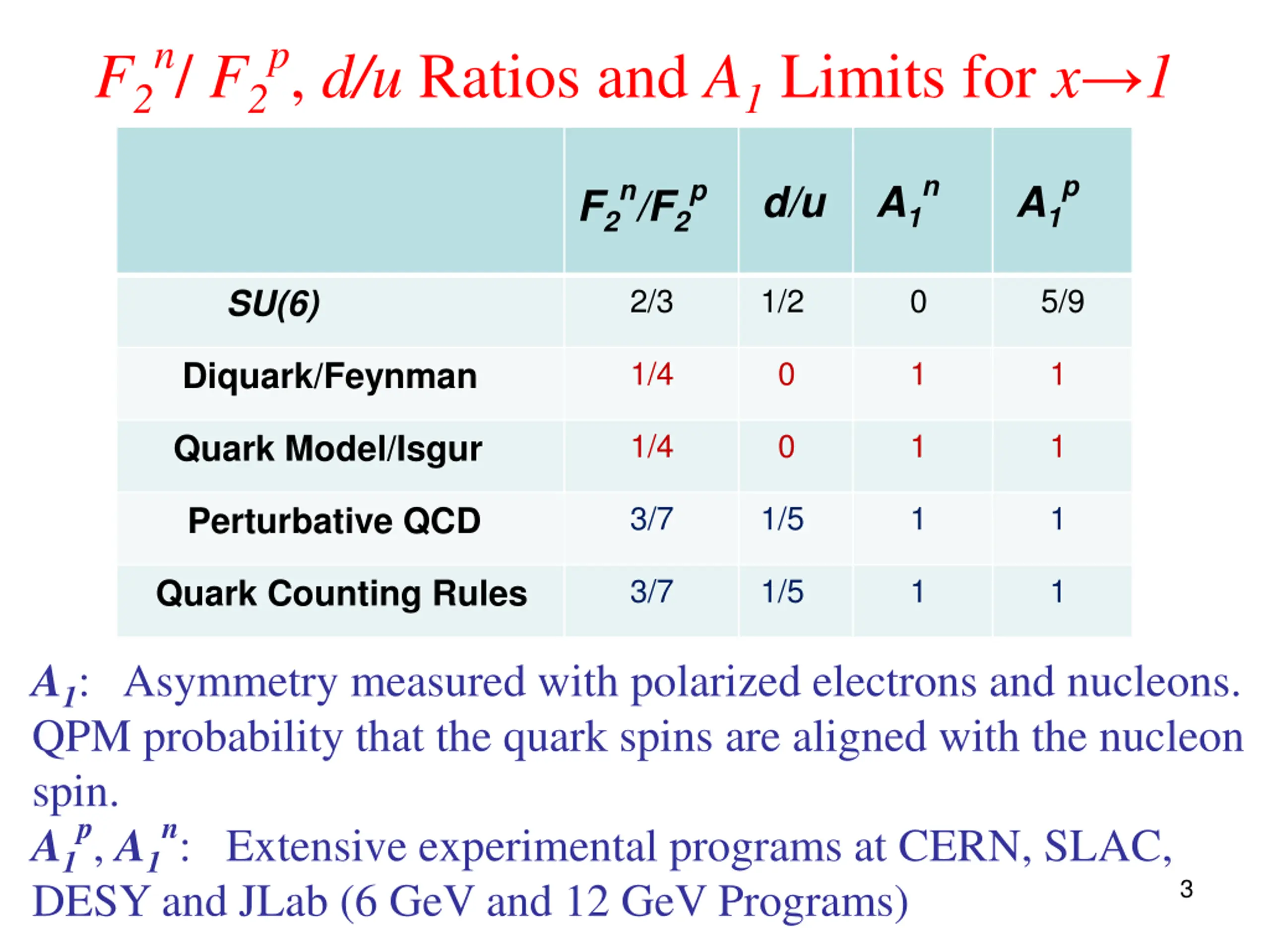 n/ F2 p, d/u Ratios and A1 Limits for x 1 F2 n p n/F2 p d/u A1 A1 F2 SU(6) 2/3 1/2 0 5/9 1/4 0 1 1 Diquark/Feynman 1/4 0 1 1 Quark Model/Isgur 3/7 1/5 1 1 Perturbative QCD 3/7 1/5 1 1 Quark Counting Rules A1: Asymmetry measured with polarized electrons and nucleons. QPM probability that the quark spins are aligned with the nucleon spin. A1 DESY and JLab (6 GeV and 12 GeV Programs) p, A1 n: Extensive experimental programs at CERN, SLAC, 3