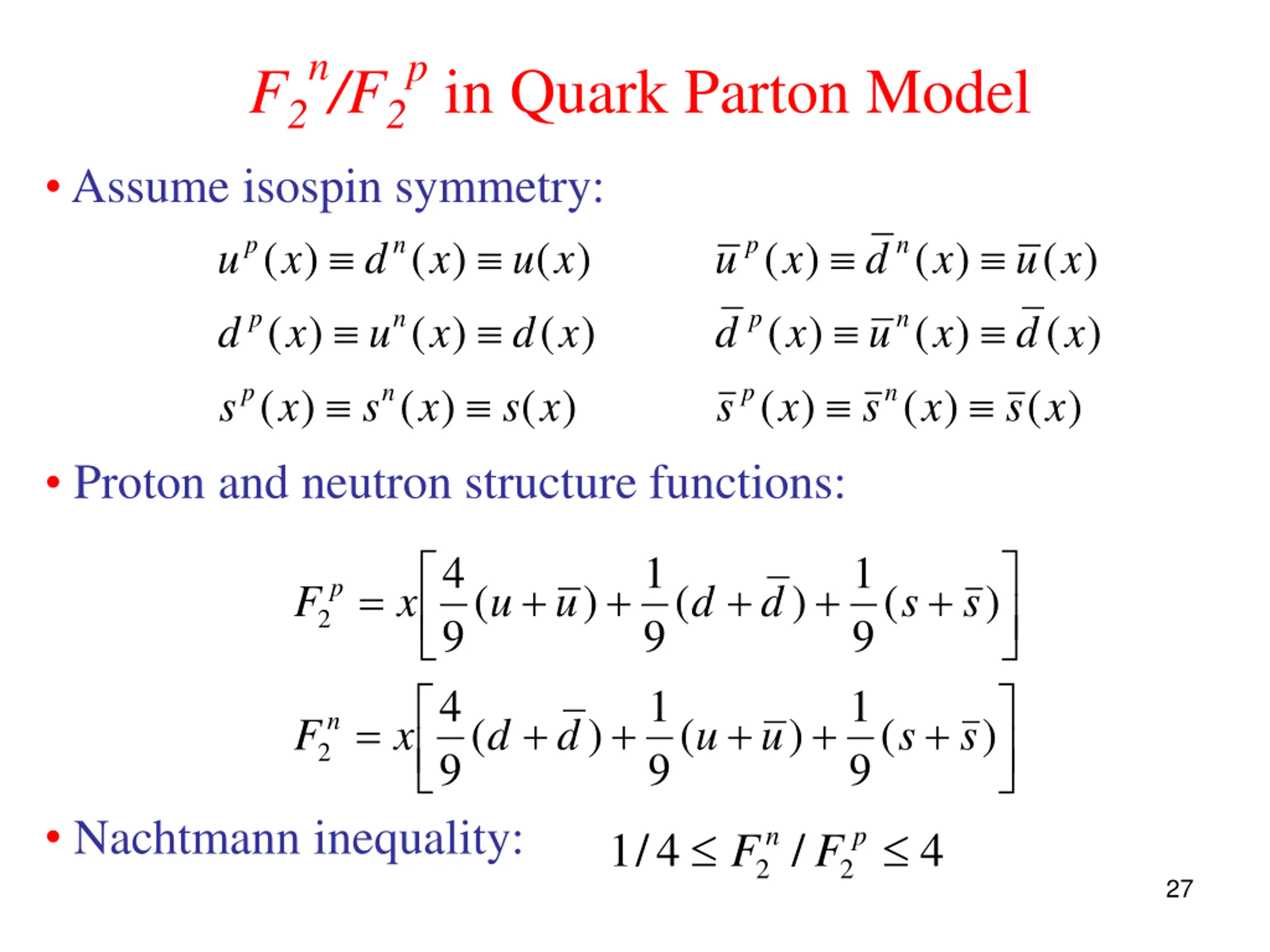 n/F2 p in Quark Parton Model F2 Assume isospin symmetry: ) ( x u p n p n ( ) ( ) ( ) ( ) ( ) d x u x u x d x u x p n p n ( ) ( ) ( ) ( ) ( ) ( ) d x u x d x d x u x d x p n p n ( ) ( ) ( ) ( ) ( ) ( ) s x s x s x s x s x s x Proton and neutron structure functions: 4 1 1 = + + + + + p ( ) ( ) ( ) F x u u d d s s 2 9 9 9 4 1 1 = + + + + + n ( ) ( ) ( ) F x d d u u s s 2 9 9 9 Nachtmann inequality: nF p / 1 4 / 4 F 2 2 27