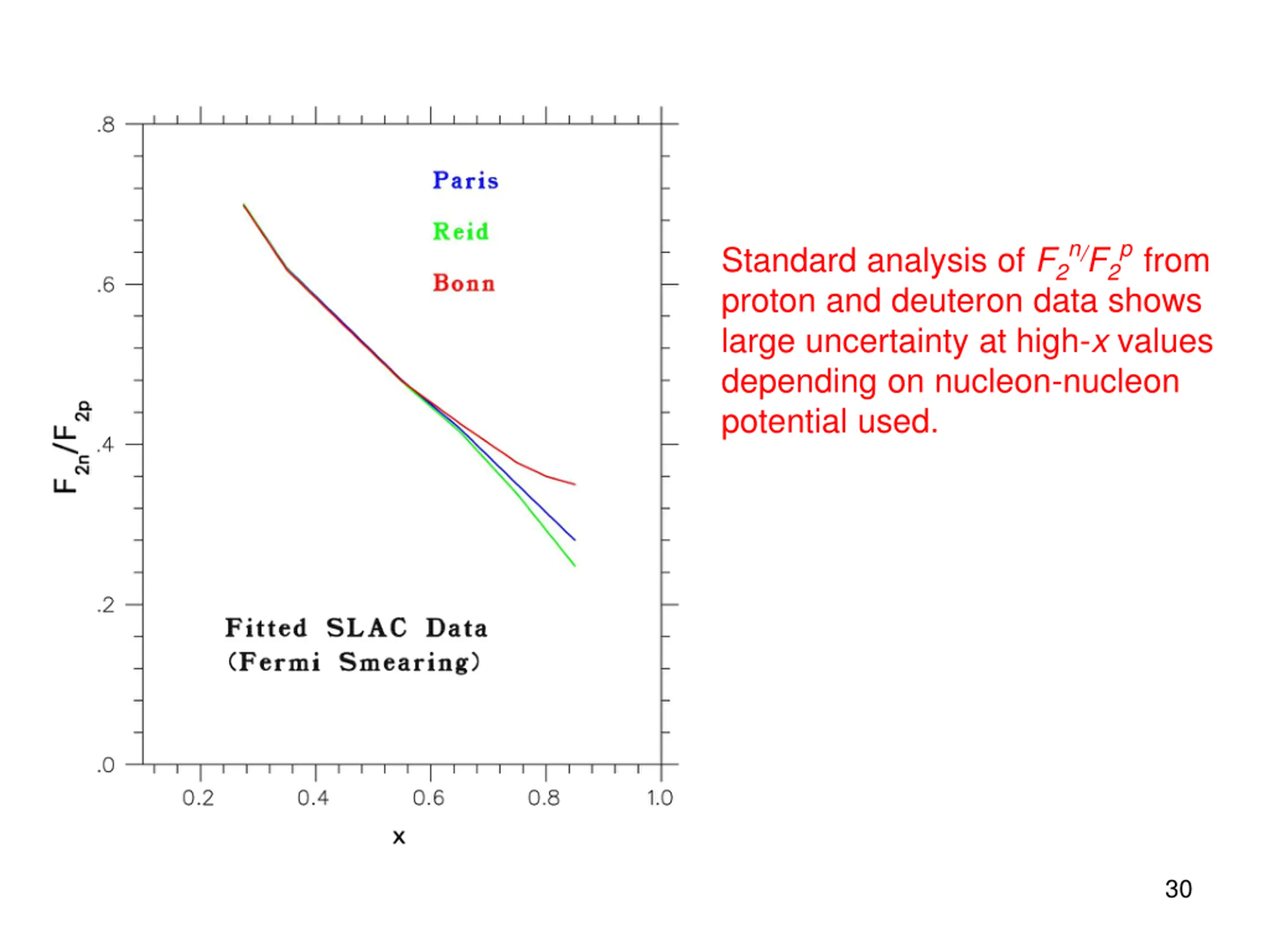 n/F2 p from Standard analysis of F2 proton and deuteron data shows large uncertainty at high-x values depending on nucleon-nucleon potential used. 30