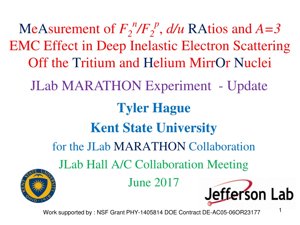 n/F2 p, d/u RAtios and A=3 MeAsurement of F2 EMC Effect in Deep Inelastic Electron Scattering Off the Tritium and Helium MirrOr Nuclei JLab MARATHON Experiment - Update Tyler Hague Kent State University for the JLab MARATHON Collaboration JLab Hall A/C Collaboration Meeting June 2017 1 Work supported by : NSF Grant PHY-1405814 DOE Contract DE-AC05-06OR23177