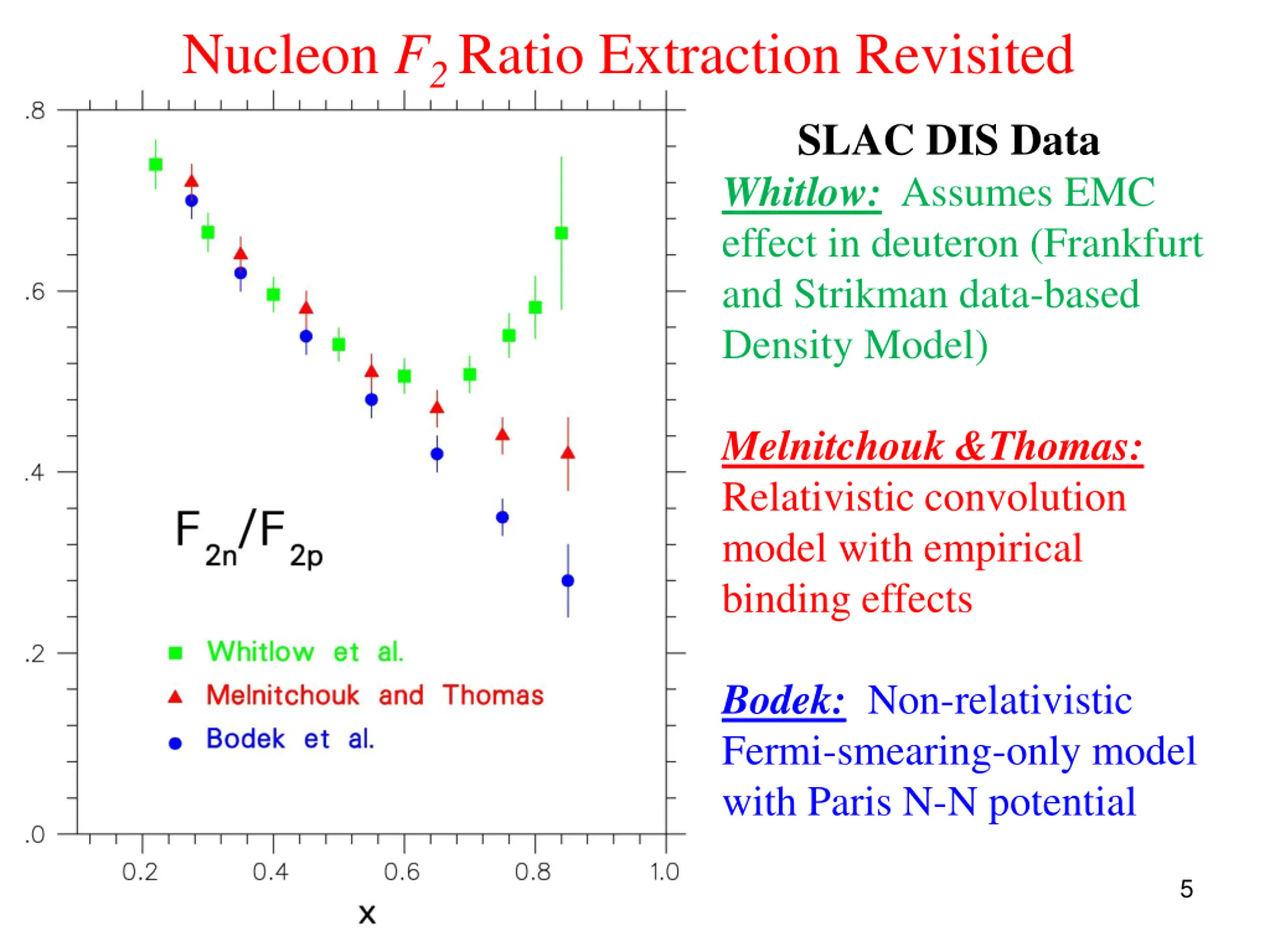 Nucleon F2Ratio Extraction Revisited SLAC DIS Data Whitlow: Assumes EMC effect in deuteron (Frankfurt and Strikman data-based Density Model) Melnitchouk &Thomas: Relativistic convolution model with empirical binding effects Bodek: Non-relativistic Fermi-smearing-only model with Paris N-N potential 5