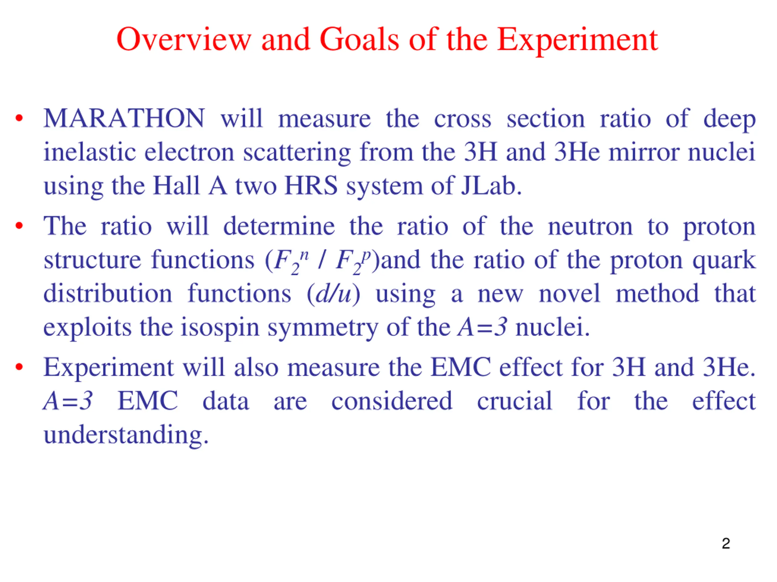 Overview and Goals of the Experiment MARATHON will measure the cross section ratio of deep inelastic electron scattering from the 3H and 3He mirror nuclei using the Hall A two HRS system of JLab. The ratio will determine the ratio of the neutron to proton structure functions (F2n / F2p)and the ratio of the proton quark distribution functions (d/u) using a new novel method that exploits the isospin symmetry of the A=3 nuclei. Experiment will also measure the EMC effect for 3H and 3He. A=3 EMC data are considered crucial for the effect understanding. 2