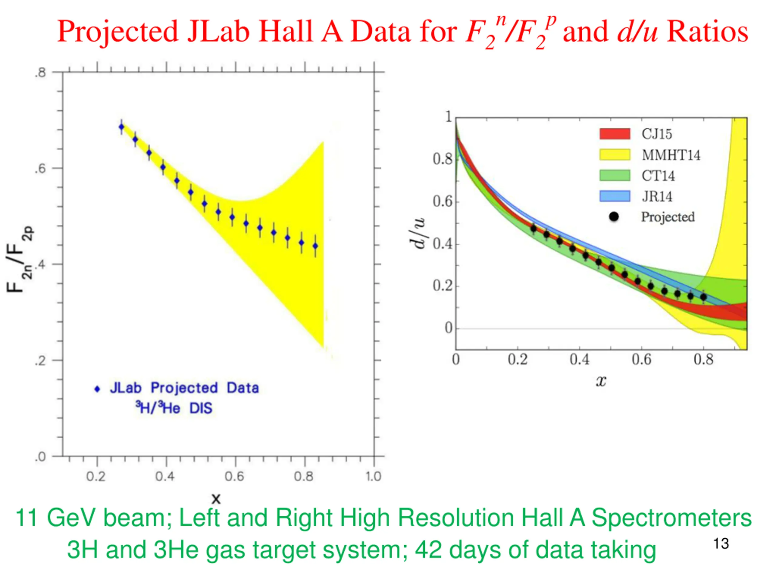 pand d/u Ratios n/F2 Projected JLab Hall A Data for F2 11 GeV beam; Left and Right High Resolution Hall A Spectrometers 3H and 3He gas target system; 42 days of data taking 13