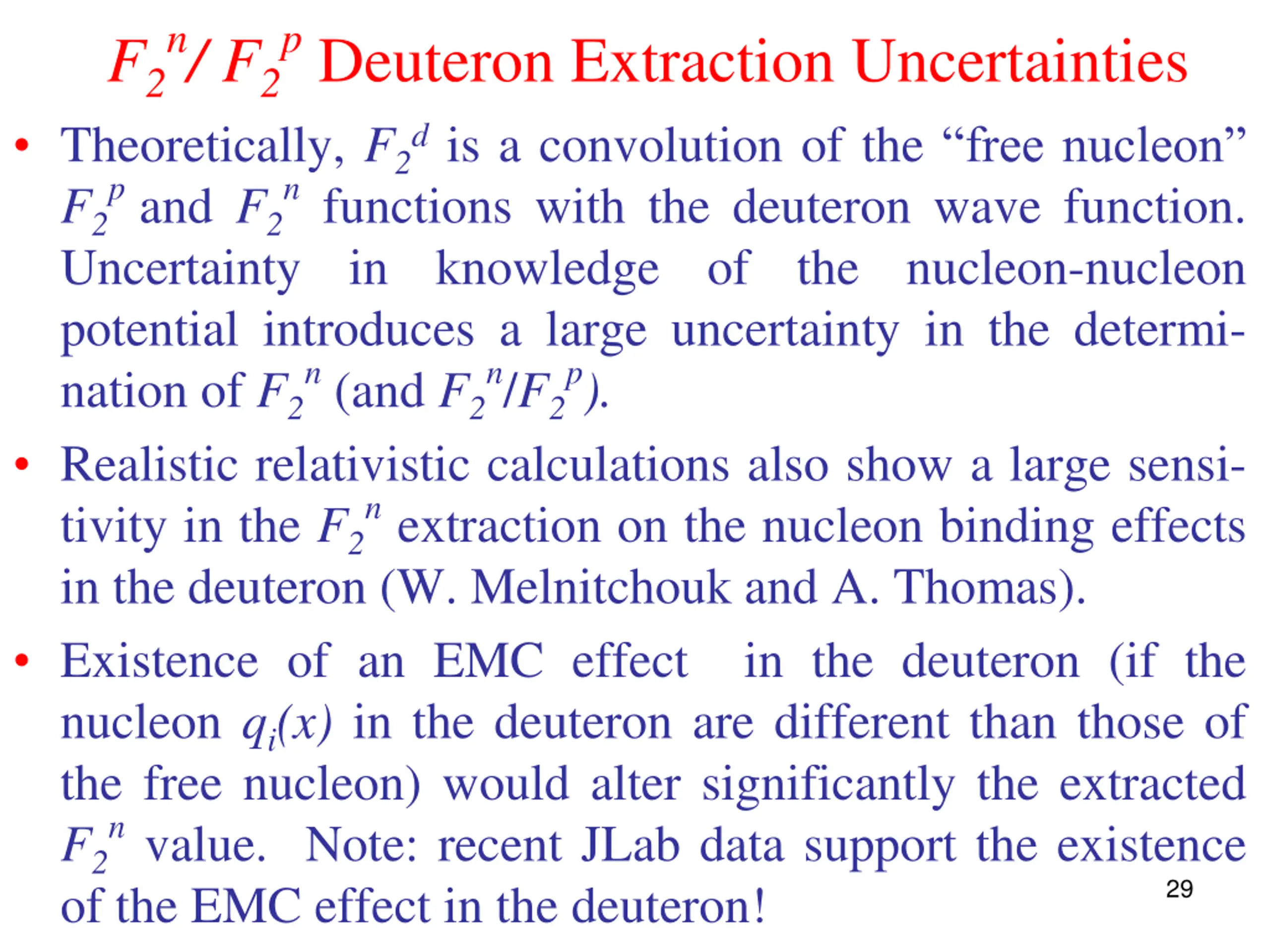 pDeuteron Extraction Uncertainties Theoretically, F2d is a convolution of the freenucleon F2 Uncertainty in knowledge of the nucleon-nucleon potential introduces a large uncertainty in the determi- nation of F2 Realistic relativistic calculations also show a large sensi- tivityin the F2 in the deuteron (W. Melnitchouk and A. Thomas). Existence of an EMC effect in the deuteron (if the nucleon qi(x)in the deuteron are different than those of the free nucleon) would alter significantly the extracted F2 of the EMC effect in the deuteron! n/ F2 F2 pand F2 n functions with the deuteron wave function. n (and F2 n/F2 p). n extraction on the nucleon binding effects n value. Note: recent JLab data support the existence 29