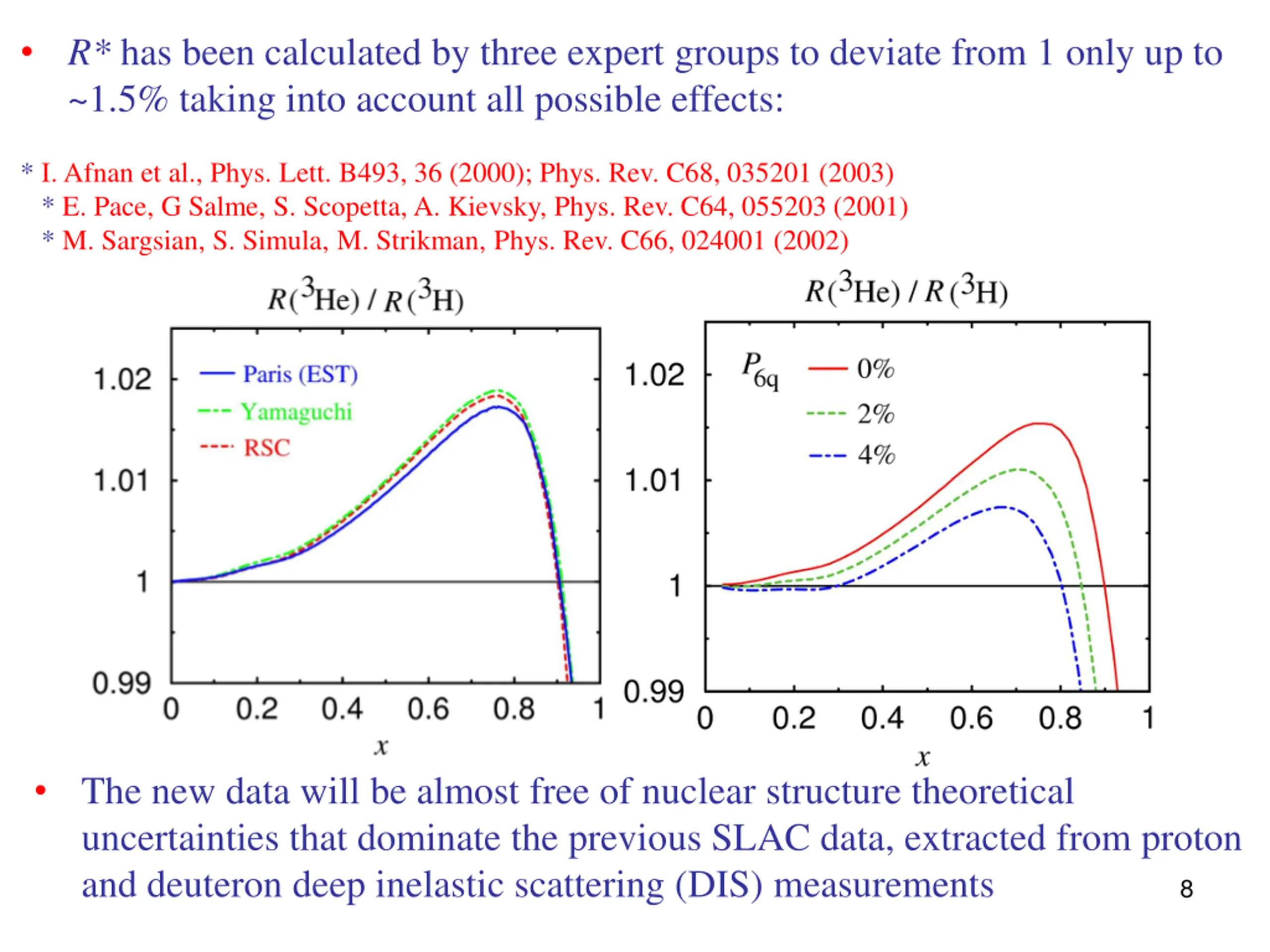R* has been calculated by three expert groups to deviate from 1 only up to ~1.5% taking into account all possible effects: * I. Afnan et al., Phys. Lett. B493, 36 (2000); Phys. Rev. C68, 035201 (2003) * E. Pace, G Salme, S. Scopetta, A. Kievsky, Phys. Rev. C64, 055203 (2001) * M. Sargsian, S. Simula, M. Strikman, Phys. Rev. C66, 024001 (2002) The new data will be almost free of nuclear structure theoretical uncertaintiesthat dominate the previous SLAC data, extracted from proton and deuteron deep inelastic scattering (DIS) measurements 8