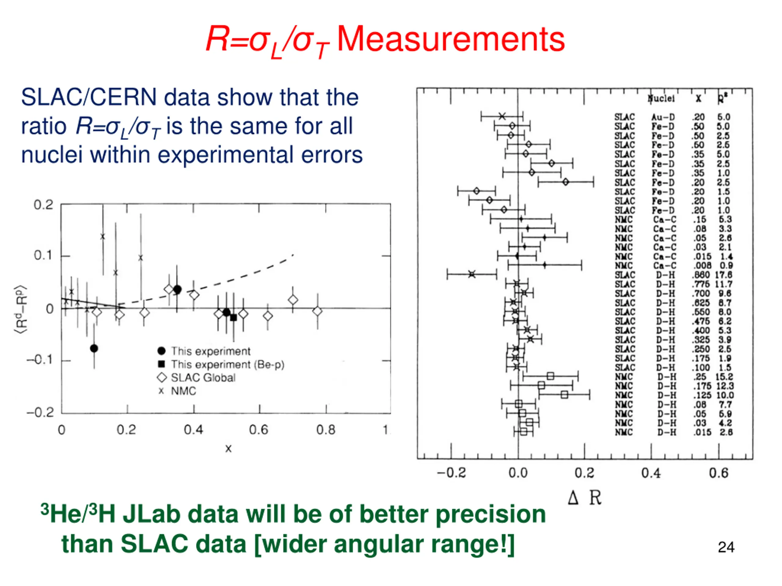 R=L/TMeasurements SLAC/CERN data show that the ratio R= L/ Tis the same for all nuclei within experimental errors 3He/3H JLab data will be of better precision than SLAC data [wider angular range!] 24