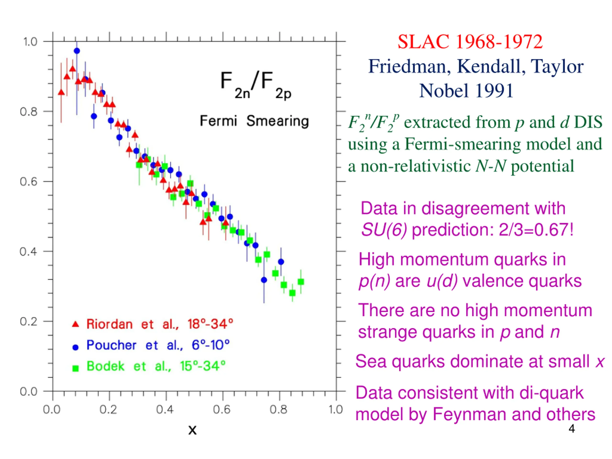 SLAC 1968-1972 Friedman, Kendall, Taylor Nobel 1991 n/F2 pextracted from p and d DIS F2 using a Fermi-smearing model and a non-relativistic N-N potential Data in disagreement with SU(6) prediction: 2/3=0.67! High momentum quarks in p(n) are u(d) valence quarks There are no high momentum strange quarks in p and n Sea quarks dominate at small x Data consistent with di-quark model by Feynman and others 4