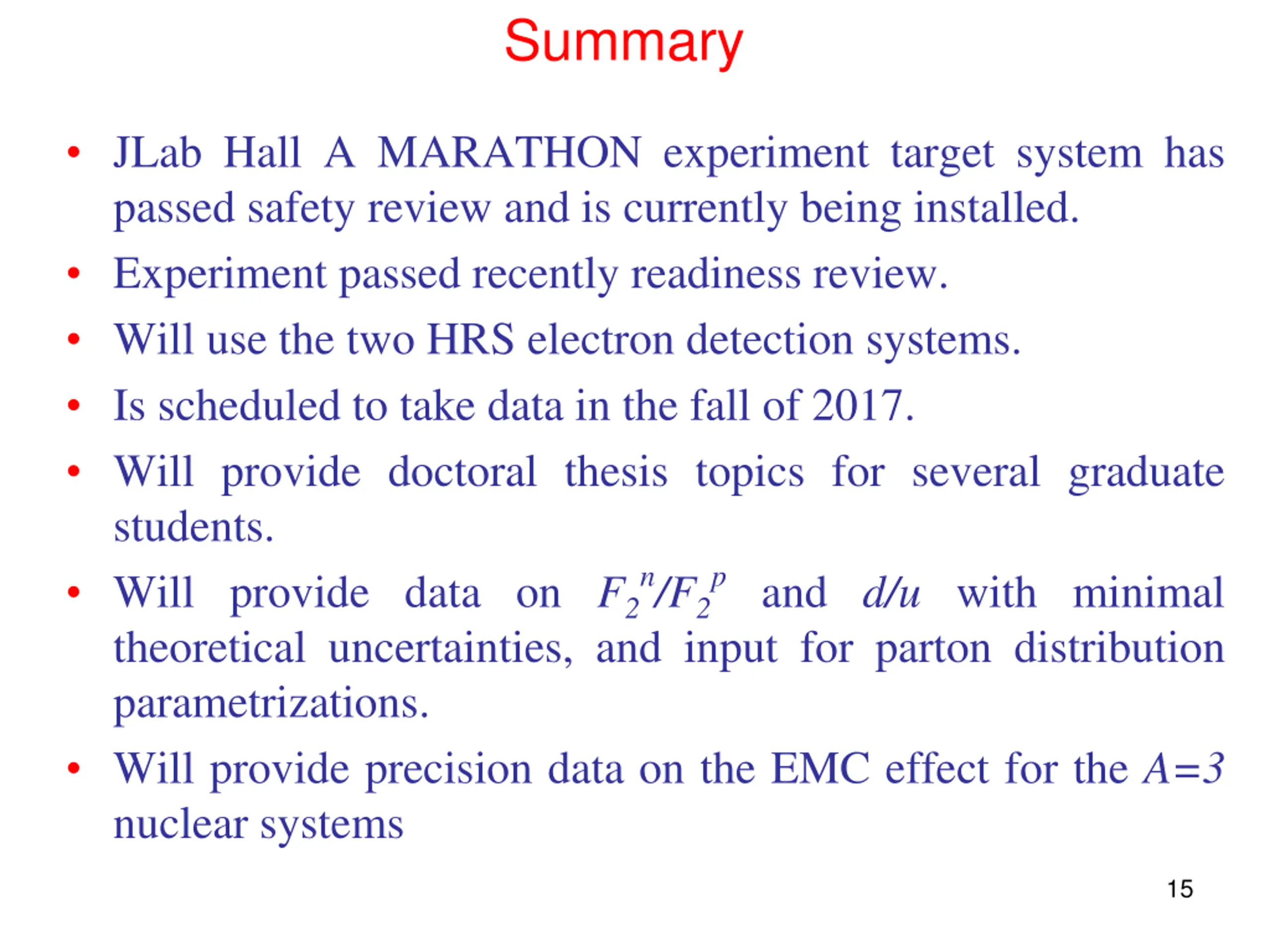 Summary JLab Hall A MARATHON experiment target system has passed safety review and is currently being installed. Experiment passed recently readiness review. Will use the two HRS electron detection systems. Is scheduled to take data in the fall of 2017. Will provide doctoral thesis topics for several graduate students. Will provide data on F2 theoretical uncertainties, and input for parton distribution parametrizations. Will provide precision data on the EMC effect for the A=3 nuclear systems n/F2 p and d/u with minimal 15