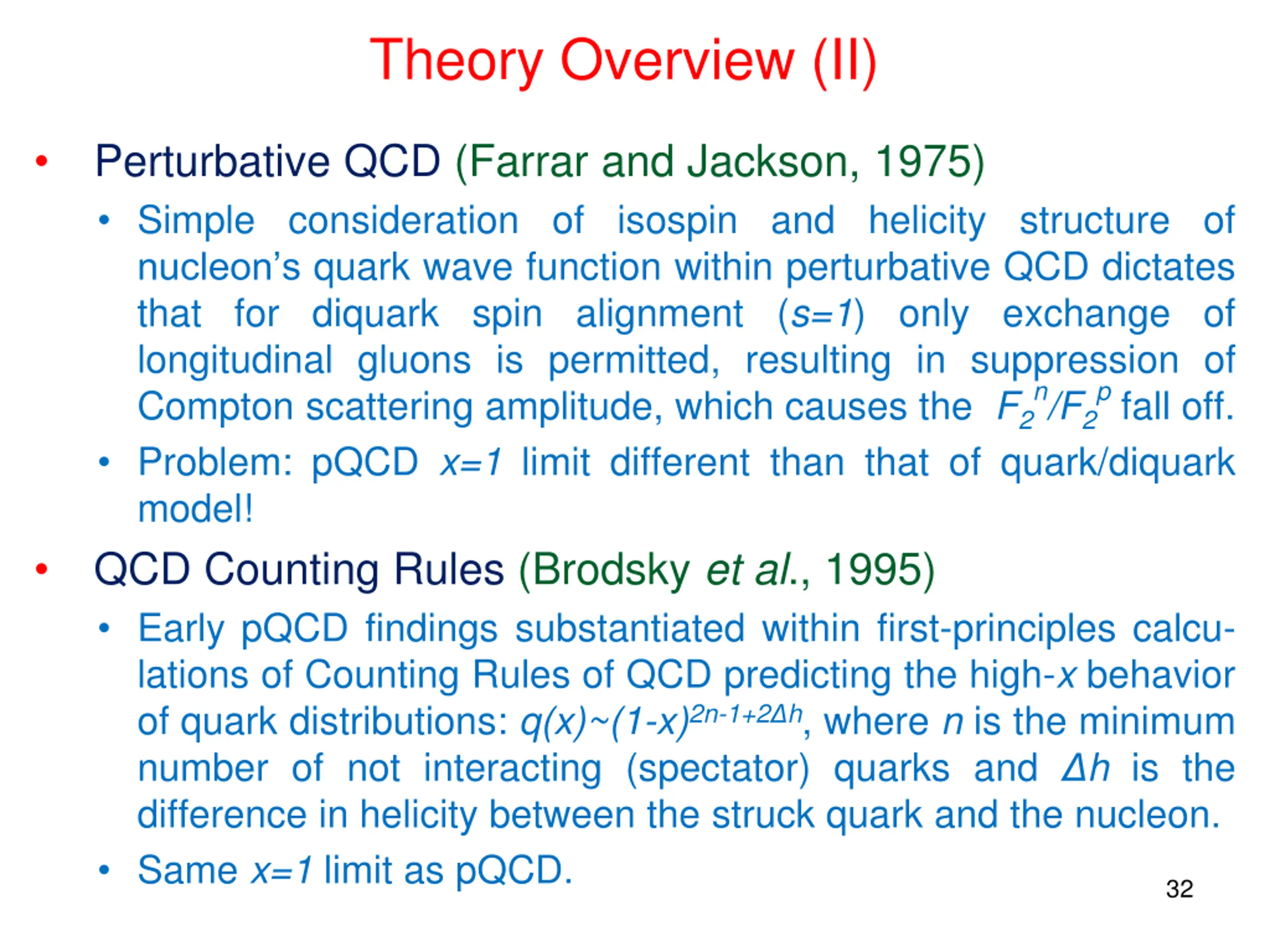 Theory Overview (I) SU(6)-breaking Diquark Model (Close/Feynman, 1970 s) Phenomenological explanation: fall off of F2 limit easily explainable using SU(6) nucleon wave function (Close, 1973) or Regge theory (Feynman, 1975) and assuming that the spectator diquark configuration with total spin s=1 is suppressed relative to that with s=0. Limit at x=1 in agreement with the SLAC/CERN data. Constituent Quark Model (Isgur and Carl, 1980-2000) Suppression fully understood in the hyperfine-perturbed quark model: color-magnetic hyperfine interaction generated by gluon exchange is proportional to quark spin dot products si sj. Force is repulsive(attractive) for parallel(antiparallel) spins and allows the u(x) and d(x) quark momentum distributions to be different. Limit for x=1 in agreement with the diquark model and data. n/F2 p and its x=1 31