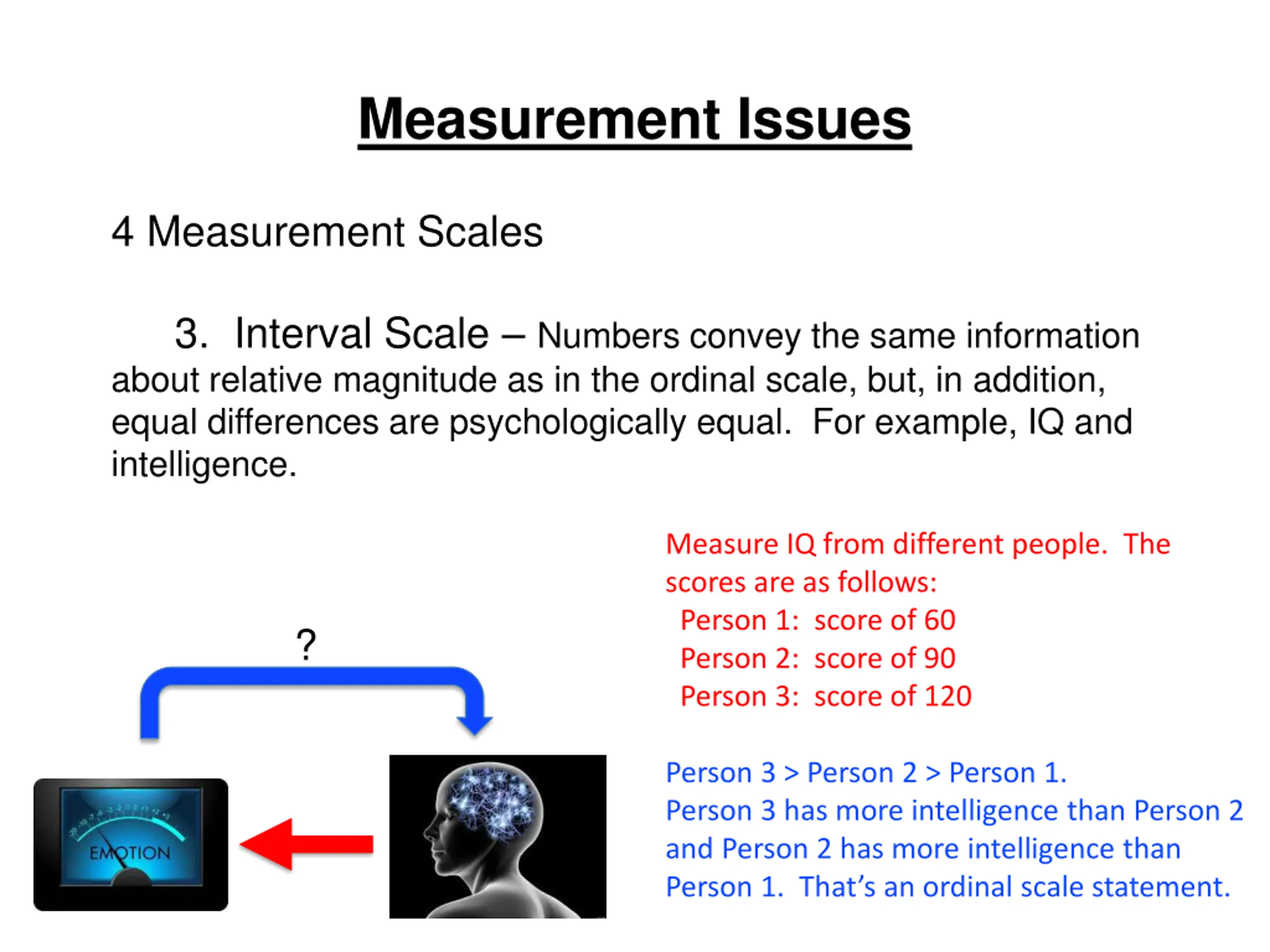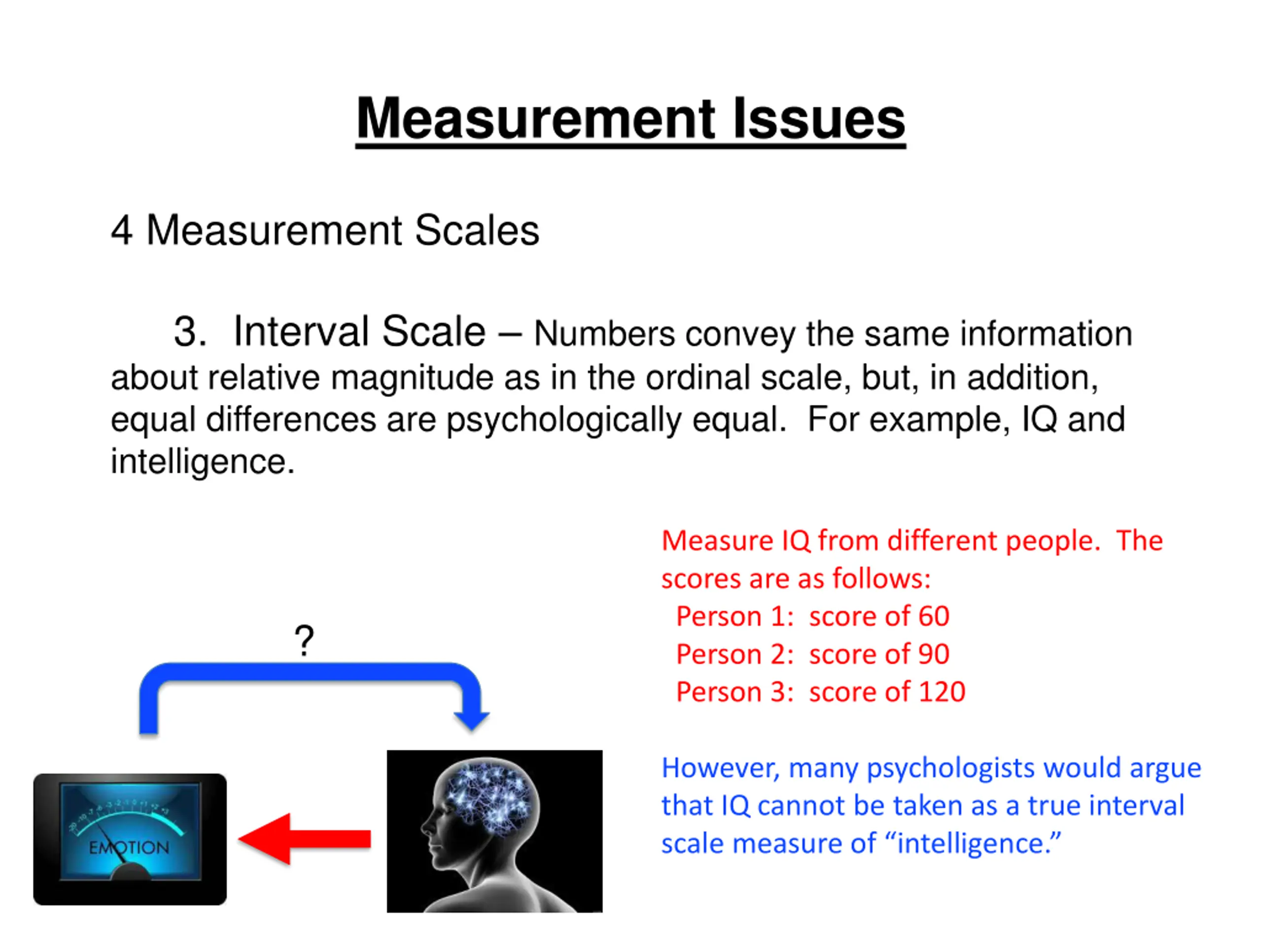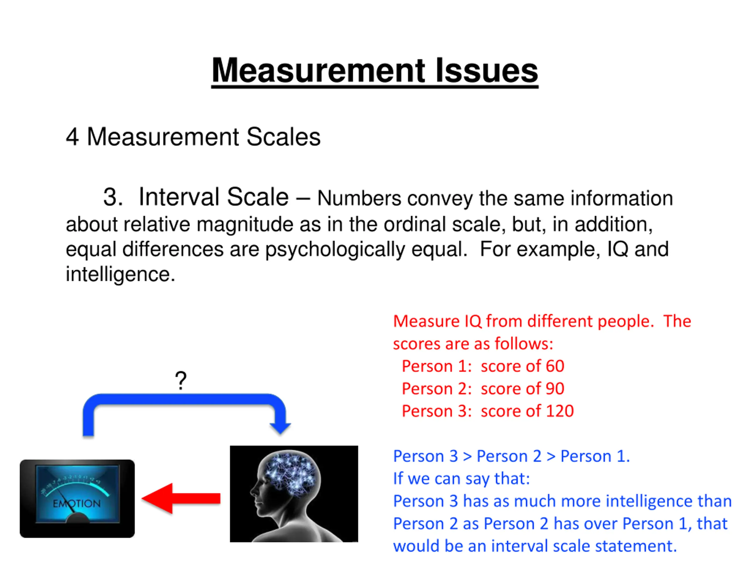 Measurement Issues 4 Measurement Scales about relative magnitude as in the ordinal scale, but, in addition, equal differences are psychologically equal. For example, IQ and intelligence. 3. Interval Scale Numbers convey the same information ?