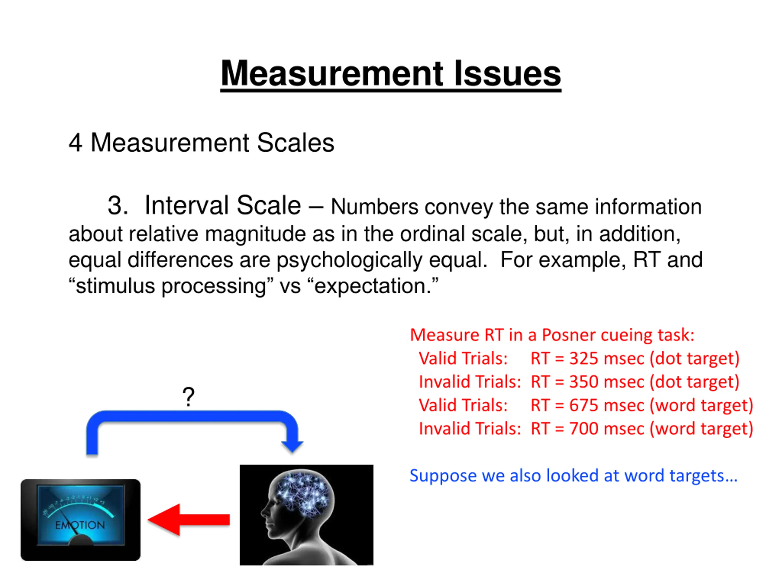 Measurement Issues 4 Measurement Scales about relative magnitude as in the ordinal scale, but, in addition, equal differences are psychologically equal. For example, RT and stimulus processing vs expectation. 3. Interval Scale Numbers convey the same information Measure RT in a Posner cueing task: Valid Trials: RT = 325 msec (dot target) Invalid Trials: RT = 350 msec (dot target) Valid Trials: RT = 675 msec (word target) Invalid Trials: RT = 700 msec (word target) ? However, if we were to use this RT difference as a measure of the psychological construct of expectation, then we d likely only assert ordinal scale properties to RT.