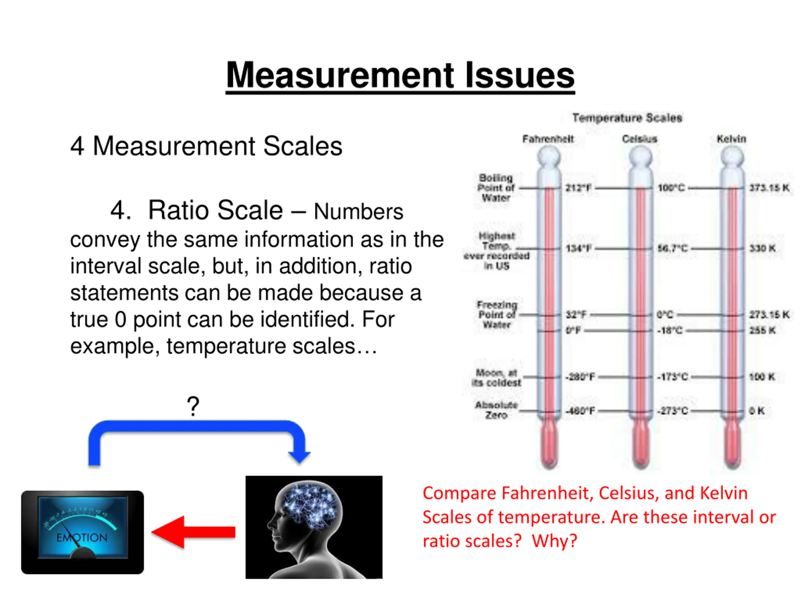 Measurement Issues 4 Measurement Scales convey the same information as in the interval scale, but, in addition, ratio statements can be made because a true 0 point can be identified. For example, temperature scales 4. Ratio Scale Numbers ? Compare Fahrenheit, Celsius, and Kelvin Scales of temperature. Are these interval or ratio scales? Why?
