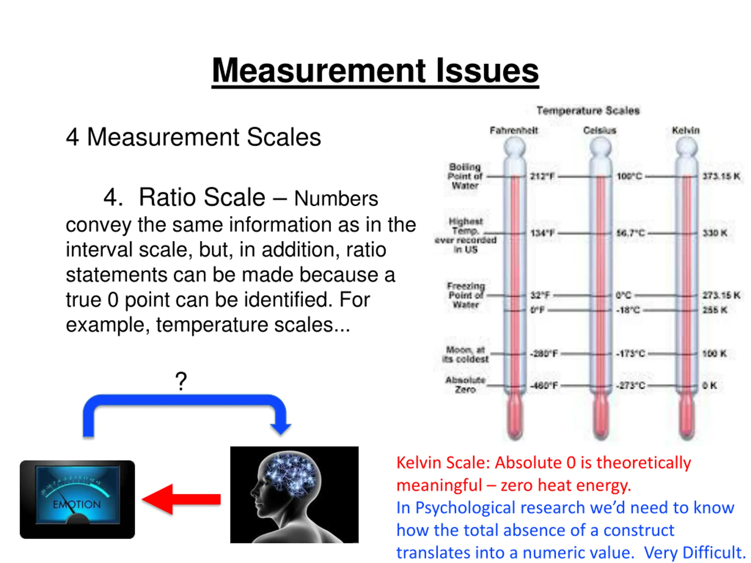Measurement Issues 4 Measurement Scales convey the same information as in the interval scale, but, in addition, ratio statements can be made because a true 0 point can be identified. For example, temperature scales... 4. Ratio Scale Numbers ? Kelvin Scale: Absolute 0 is theoretically meaningful zero heat energy. In Psychological research we d need to know how the total absence of a construct translates into a numeric value. Very Difficult.