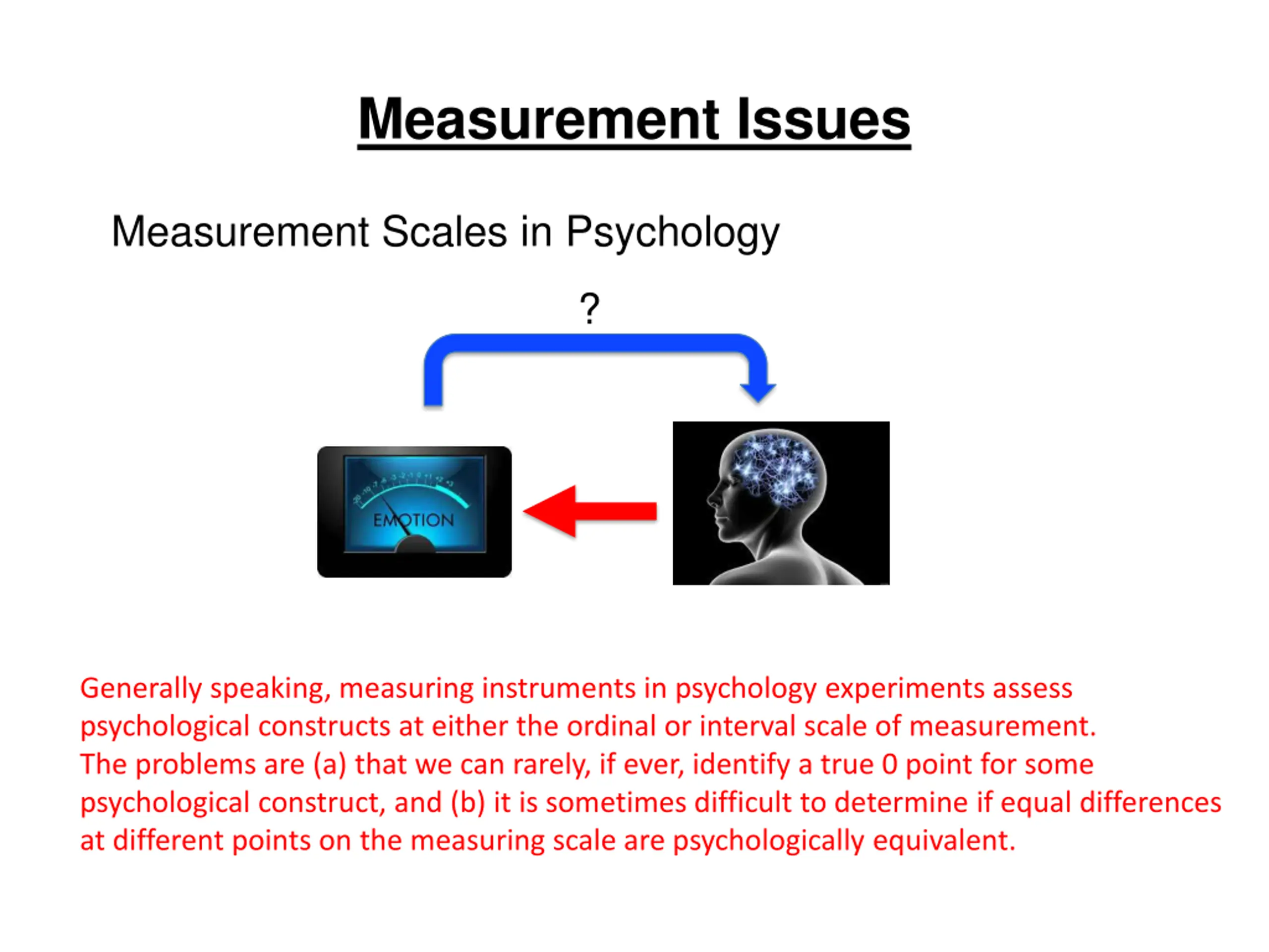 Measurement Issues Measurement Scales in Psychology ? Generally speaking, measuring instruments in psychology experiments assess psychological constructs at either the ordinal or interval scale of measurement. The problems are (a) that we can rarely, if ever, identify a true 0 point for some psychological construct, and (b) it is sometimes difficult to determine if equal differences at different points on the measuring scale are psychologically equivalent.