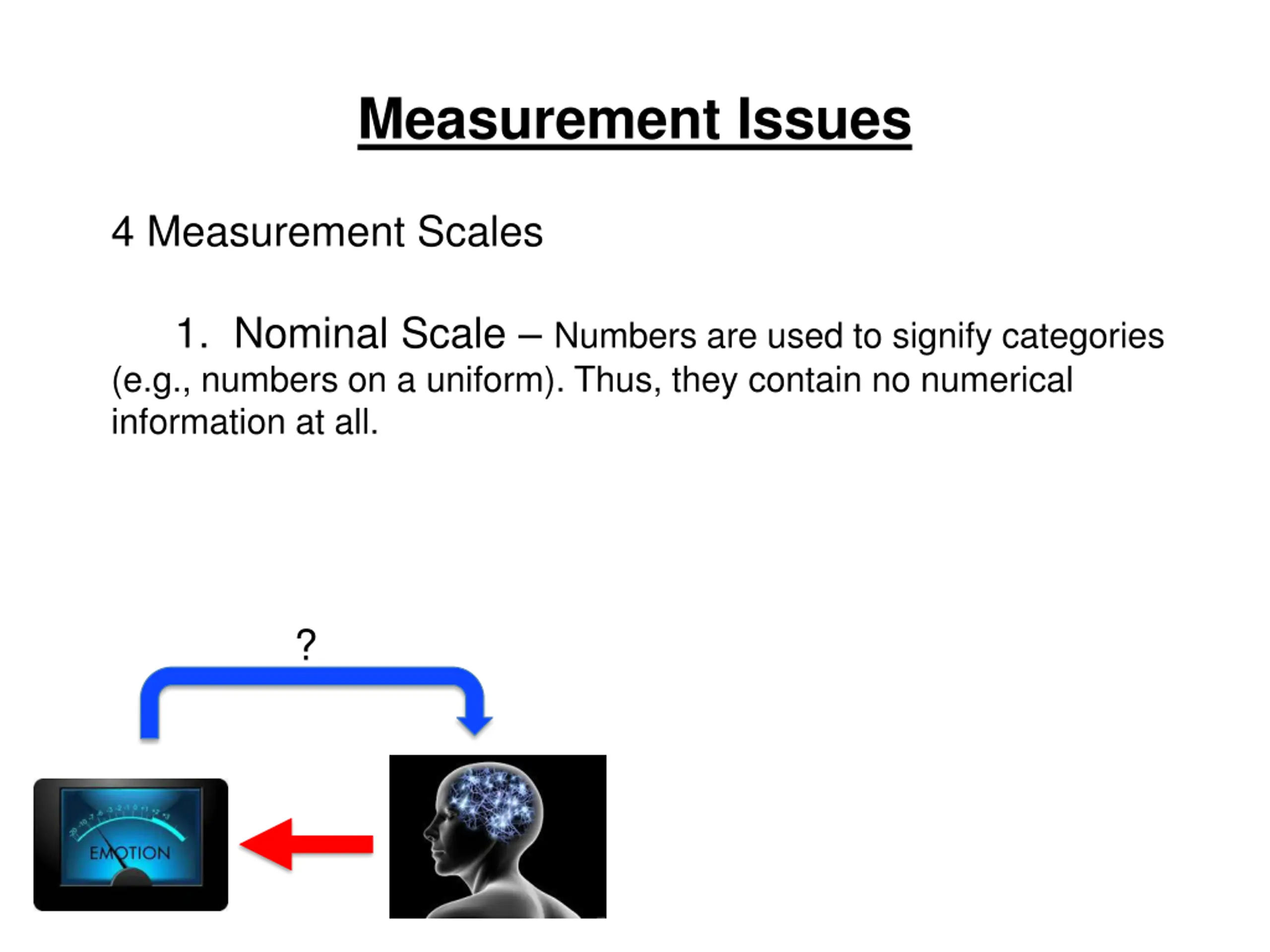 Measurement Issues 4 Measurement Scales (e.g., numbers on a uniform). Thus, they contain no numerical information at all. 1. Nominal Scale Numbers are used to signify categories ?