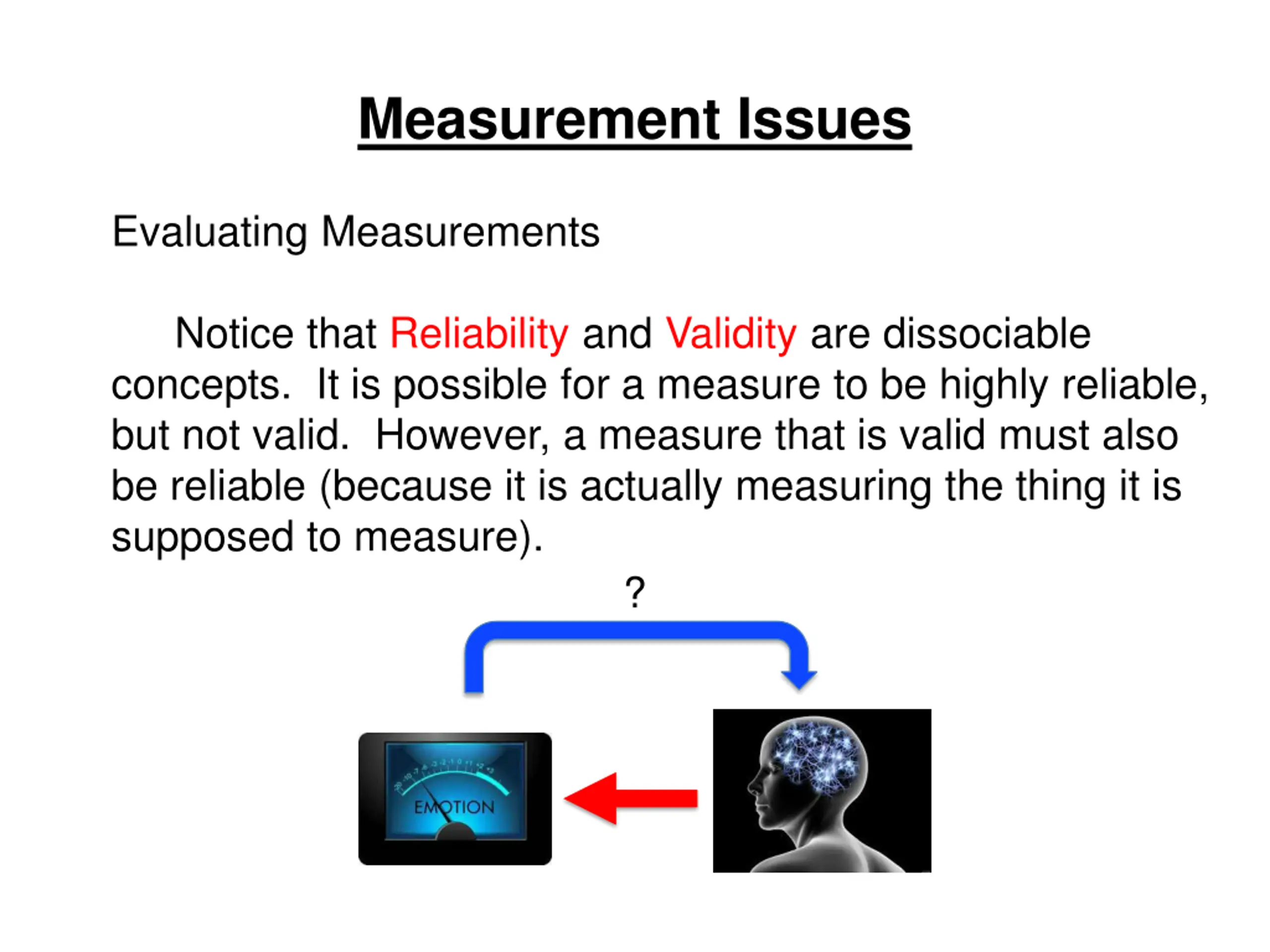 Measurement Issues Evaluating Measurements concepts. It is possible for a measure to be highly reliable, but not valid. However, a measure that is valid must also be reliable (because it is actually measuring the thing it is supposed to measure). ? Notice that Reliability and Validity are dissociable
