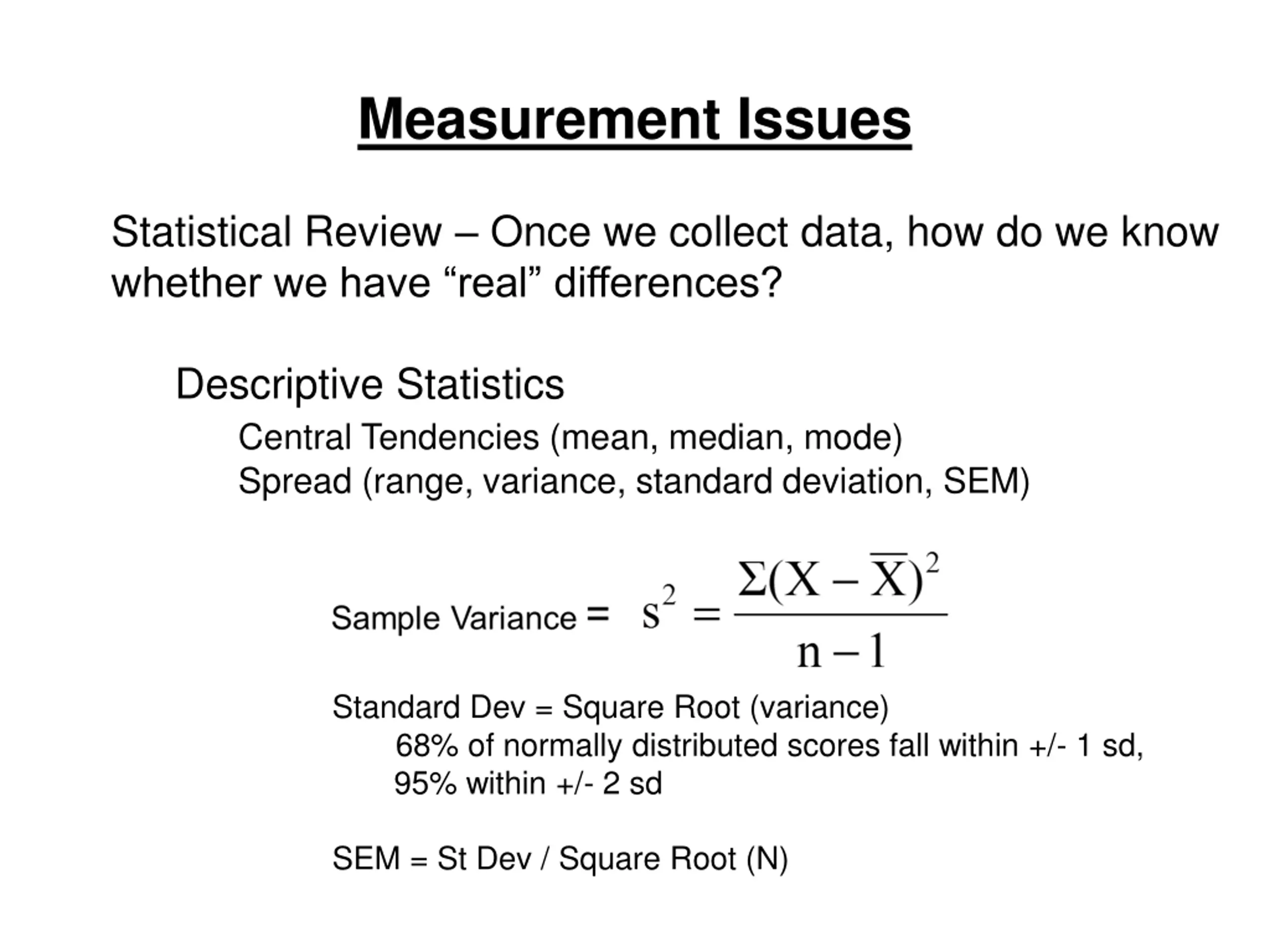Measurement Issues Statistical Review Once we collect data, how do we know whether we have real differences? Descriptive Statistics Central Tendencies (mean, median, mode) Spread (range, variance, standard deviation, SEM) Standard Dev = Square Root (variance) 68% of normally distributed scores fall within +/- 1 sd, 95% within +/- 2 sd SEM = St Dev / Square Root (N)