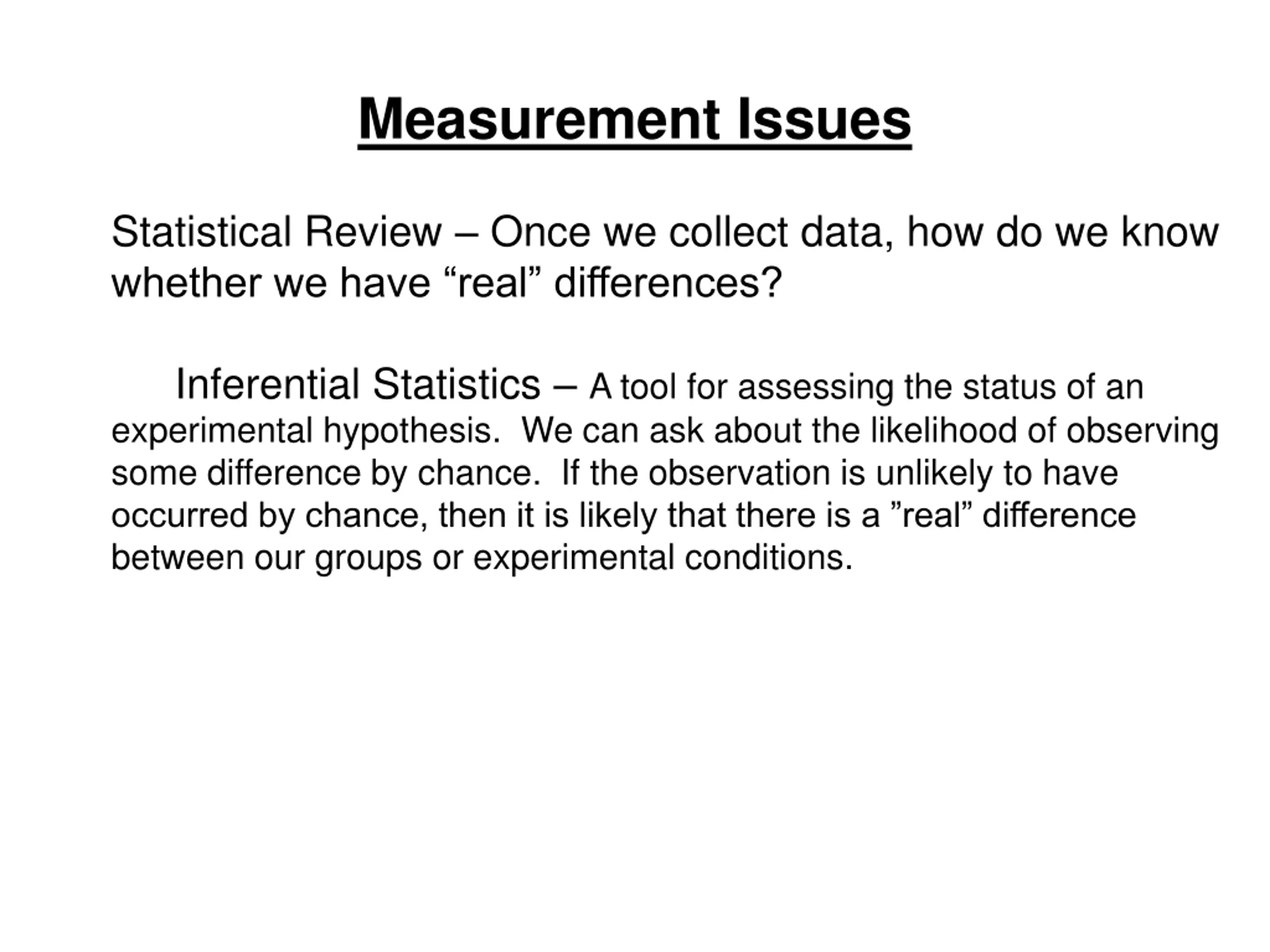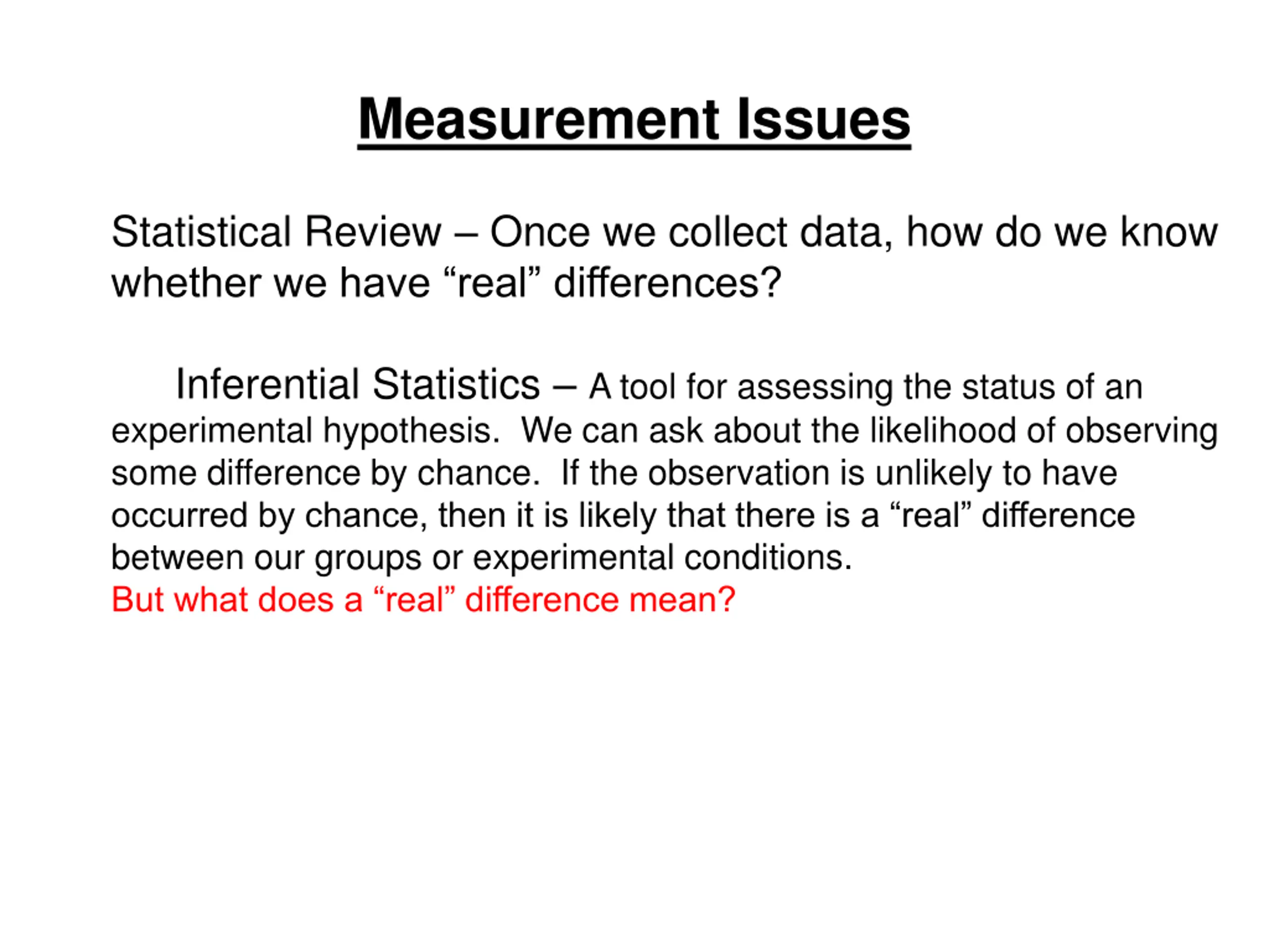 Measurement Issues Statistical Review Once we collect data, how do we know whether we have real differences? experimental hypothesis. We can ask about the likelihood of observing some difference by chance. If the observation is unlikely to have occurred by chance, then it is likely that there is a real difference between our groups or experimental conditions. But what does a real difference mean? Inferential Statistics A tool for assessing the status of an