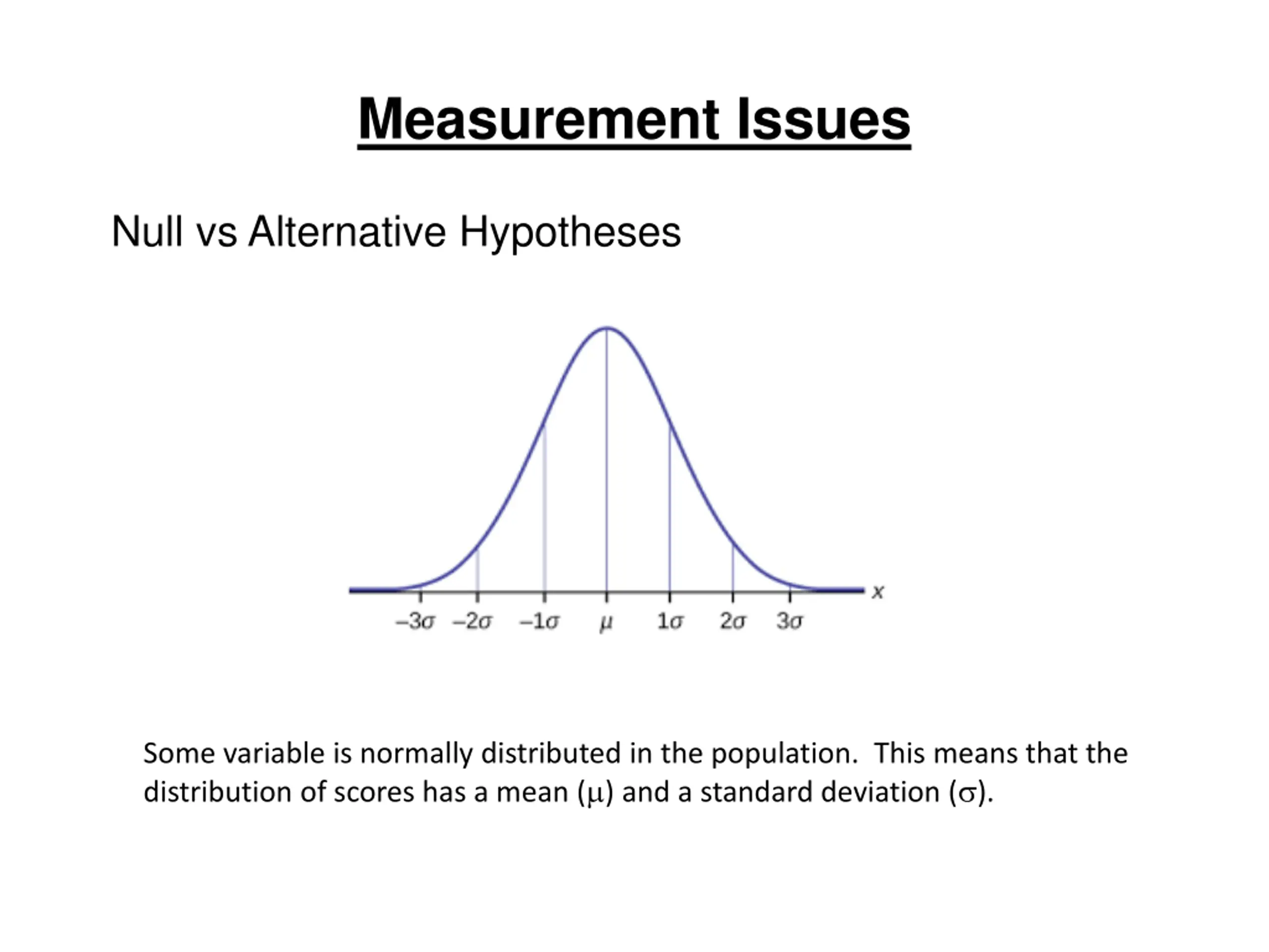 Measurement Issues Null vs Alternative Hypotheses Some variable is normally distributed in the population. This means that the distribution of scores has a mean ( ) and a standard deviation ( ).