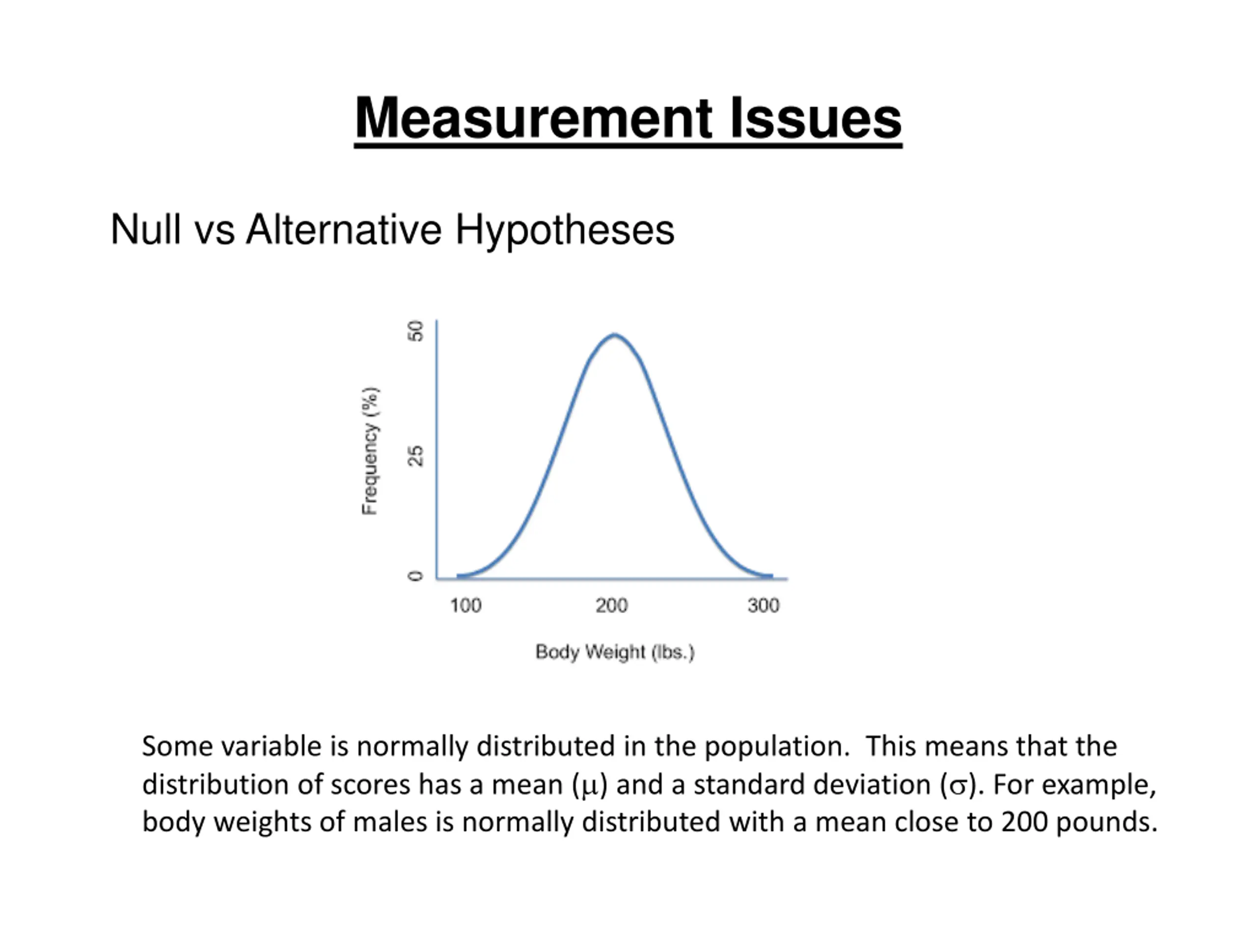 Measurement Issues Null vs Alternative Hypotheses Some variable is normally distributed in the population. This means that the distribution of scores has a mean ( ) and a standard deviation ( ). For example, body weights of males is normally distributed with a mean close to 200 pounds.
