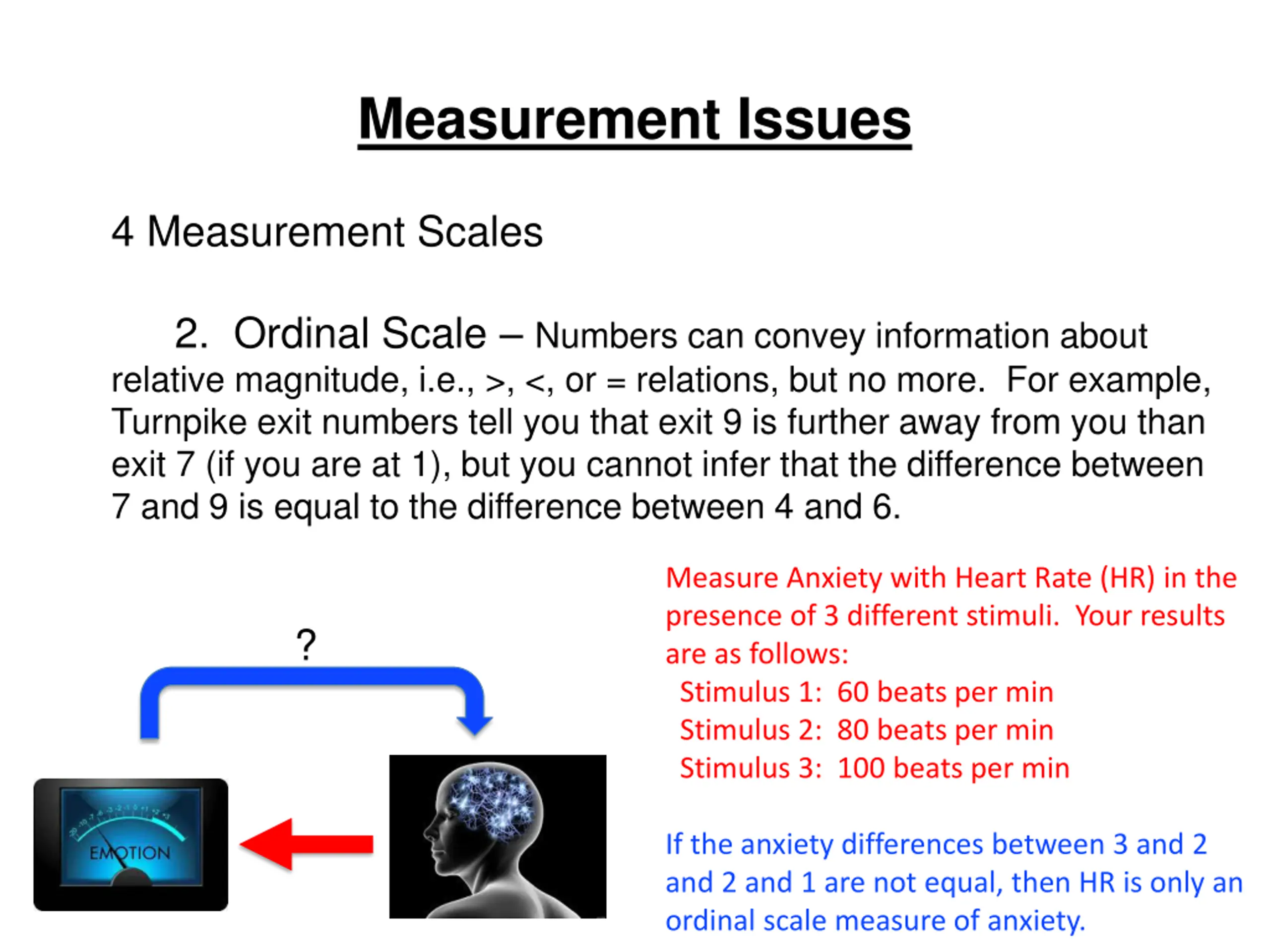Measurement Issues 4 Measurement Scales relative magnitude, i.e., >, <, or = relations, but no more. For example, Turnpike exit numbers tell you that exit 9 is further away from you than exit 7 (if you are at 1), but you cannot infer that the difference between 7 and 9 is equal to the difference between 4 and 6. 2. Ordinal Scale Numbers can convey information about Measure Anxiety with Heart Rate (HR) in the presence of 3 different stimuli. Your results are as follows: Stimulus 1: 60 beats per min Stimulus 2: 80 beats per min Stimulus 3: 100 beats per min ? If the anxiety differences between 3 and 2 and 2 and 1 are not equal, then HR is only an ordinal scale measure of anxiety.