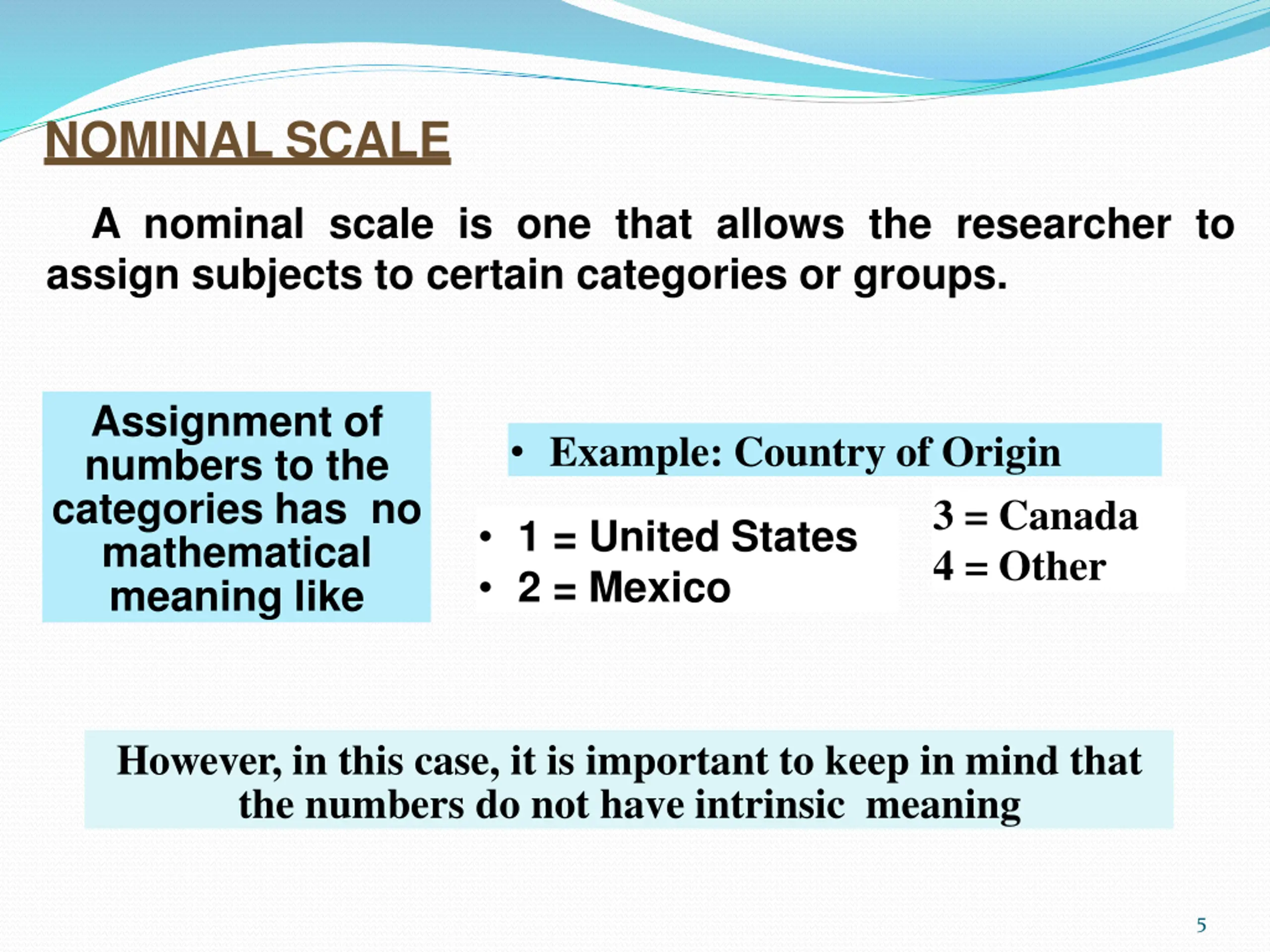 NOMINAL SCALE A nominal scale is one that allows the researcher to assign subjects to certain categories or groups. Assignment of numbers to the categories has no mathematical meaning like Example: Country of Origin 3 = Canada 4 = Other 1 = United States 2 = Mexico However, in this case, it is important to keep in mind that the numbers do not have intrinsic meaning 5