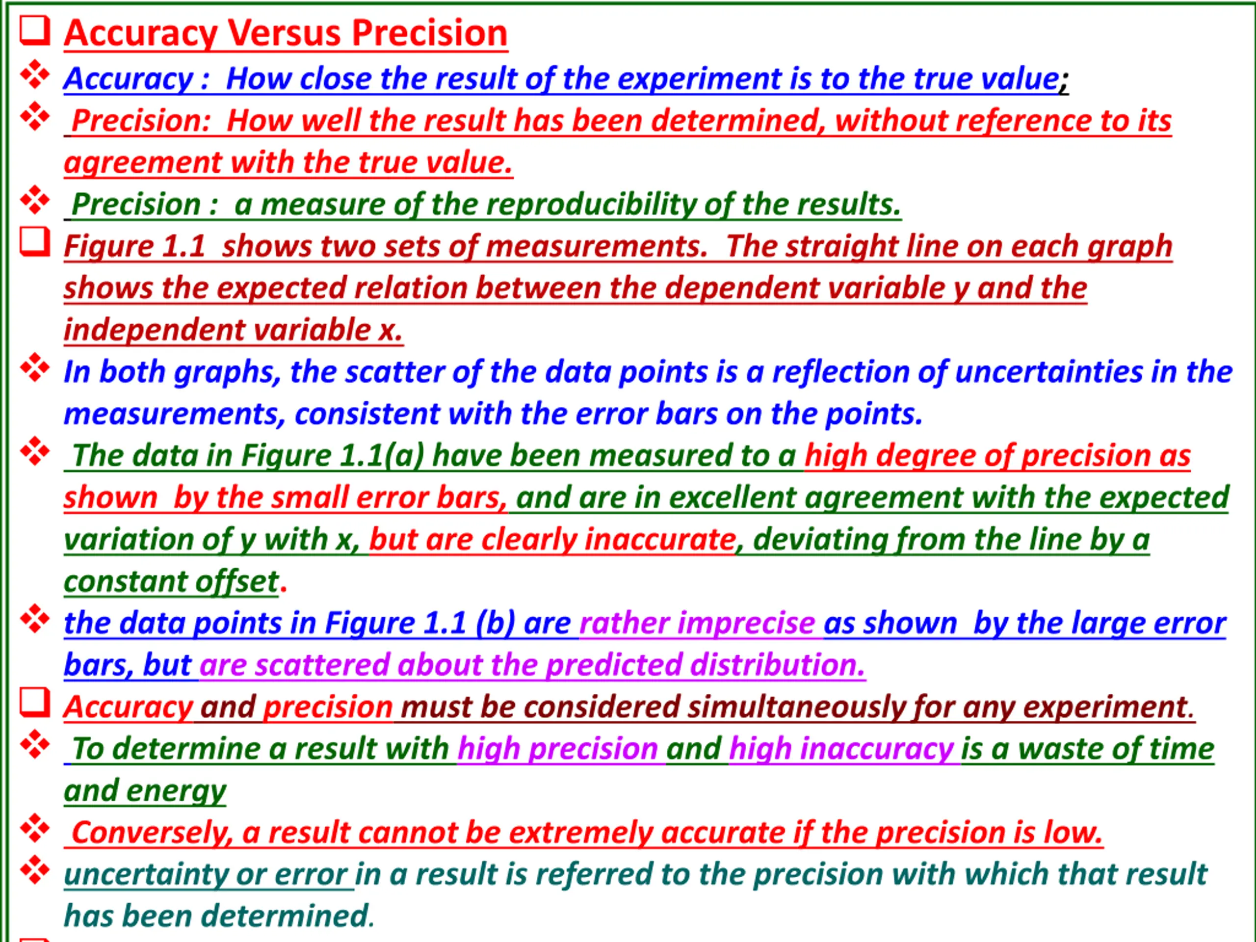 Accuracy Versus Precision Accuracy : How close the result of the experiment is to the true value; Precision: How well the result has been determined, without reference to its agreement with the true value. Precision : a measure of the reproducibility of the results. Figure 1.1 shows two sets of measurements. The straight line on each graph shows the expected relation between the dependent variable y and the independent variable x. In both graphs, the scatter of the data points is a reflection of uncertainties in the measurements, consistent with the error bars on the points. The data in Figure 1.1(a) have been measured to a high degree of precision as shown by the small error bars, and are in excellent agreement with the expected variation of y with x, but are clearly inaccurate, deviating from the line by a constant offset. the data points in Figure 1.1 (b) are rather imprecise as shown by the large error bars, but are scattered about the predicted distribution. Accuracy and precision must be considered simultaneously for any experiment. To determine a result with high precision and high inaccuracy is a waste of time and energy Conversely, a result cannot be extremely accurate if the precision is low. uncertainty or error in a result is referred to the precision with which that result has been determined. Absolute precision : magnitude of the uncertainty in the result expressed in the