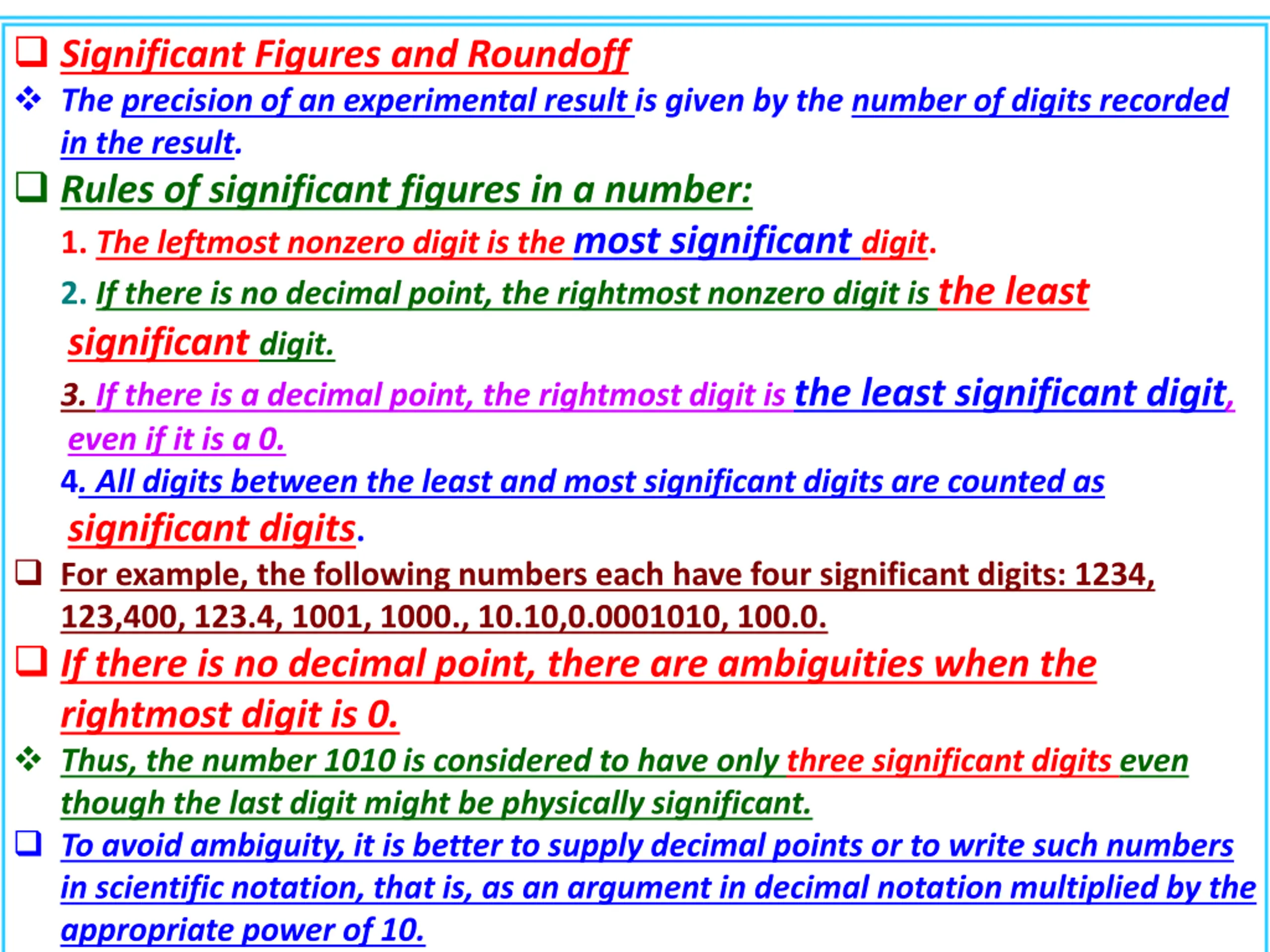 Significant Figures and Roundoff The precision of an experimental result is given by the number of digits recorded in the result. Rules of significant figures in a number: 1. The leftmost nonzero digit is the most significant digit. 2. If there is no decimal point, the rightmost nonzero digit is the least significant digit. 3. If there is a decimal point, the rightmost digit is the least significant digit, even if it is a 0. 4. All digits between the least and most significant digits are counted as significant digits. For example, the following numbers each have four significant digits: 1234, 123,400, 123.4, 1001, 1000., 10.10,0.0001010, 100.0. If there is no decimal point, there are ambiguities when the rightmost digit is 0. Thus, the number 1010 is considered to have only three significant digits even though the last digit might be physically significant. To avoid ambiguity, it is better to supply decimal points or to write such numbers in scientific notation, that is, as an argument in decimal notation multiplied by the appropriate power of 10. Thus, our example of 1010 would be written as 1010. or 1.010 X 103 if all four