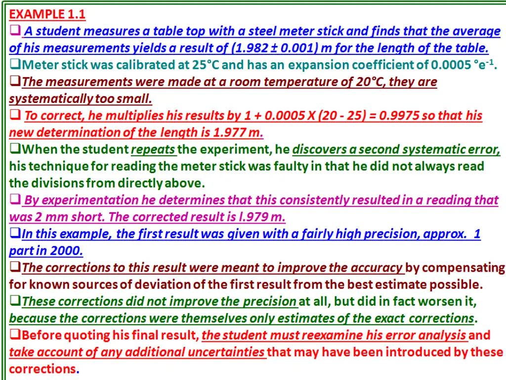 EXAMPLE 1.1 A student measures a table top with a steel meter stick and finds that the average of his measurements yields a result of (1.982 0.001) m for the length of the table. Meter stick was calibrated at 25 C and has an expansion coefficient of 0.0005 e-1. The measurements were made at a room temperature of 20 C, they are systematically too small. To correct, he multiplies his results by 1 + 0.0005 X (20 - 25) = 0.9975 so that his new determination of the length is 1.977 m. When the student repeats the experiment, he discovers a second systematic error, his technique for reading the meter stick was faulty in that he did not always read the divisions from directly above. By experimentation he determines that this consistently resulted in a reading that was 2 mm short. The corrected result is l.979 m. In this example, the first result was given with a fairly high precision, approx. 1 part in 2000. The corrections to this result were meant to improve the accuracy by compensating for known sources of deviation of the first result from the best estimate possible. These corrections did not improve the precision at all, but did in fact worsen it, because the corrections were themselves only estimates of the exact corrections. Before quoting his final result, the student must reexamine his error analysis and take account of any additional uncertainties that may have been introduced by these corrections.