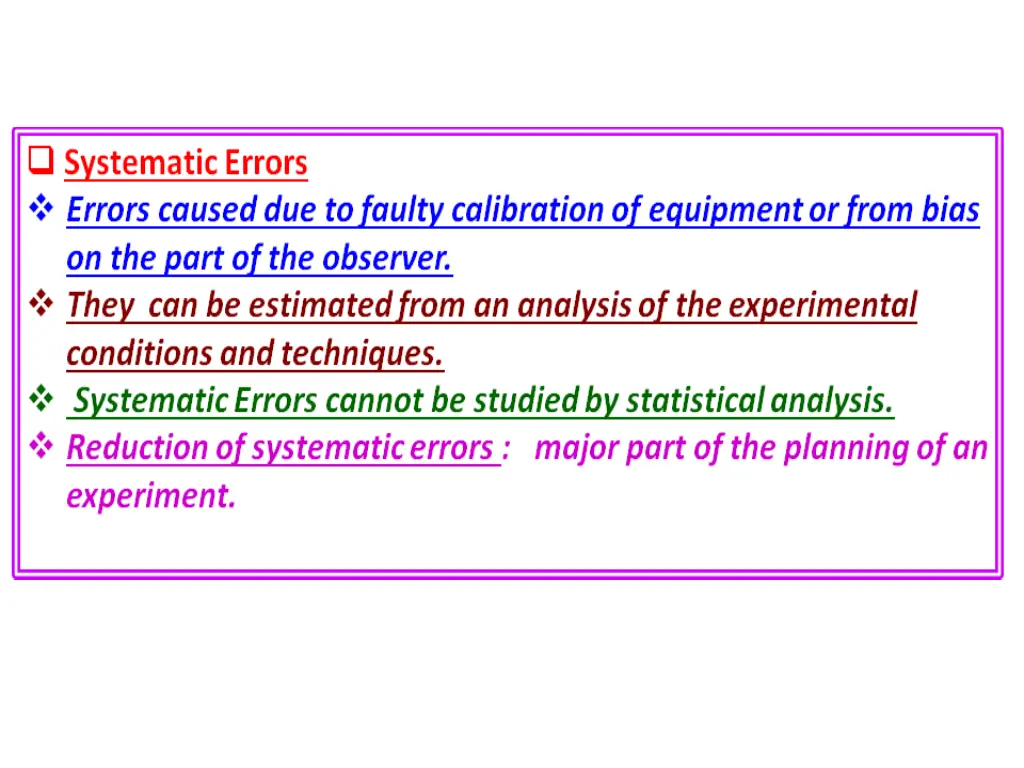 Systematic Errors Errors caused due to faulty calibration of equipment or from bias on the part of the observer. They can be estimated from an analysis of the experimental conditions and techniques. Systematic Errors cannot be studied by statistical analysis. Reduction of systematic errors : major part of the planning of an experiment.