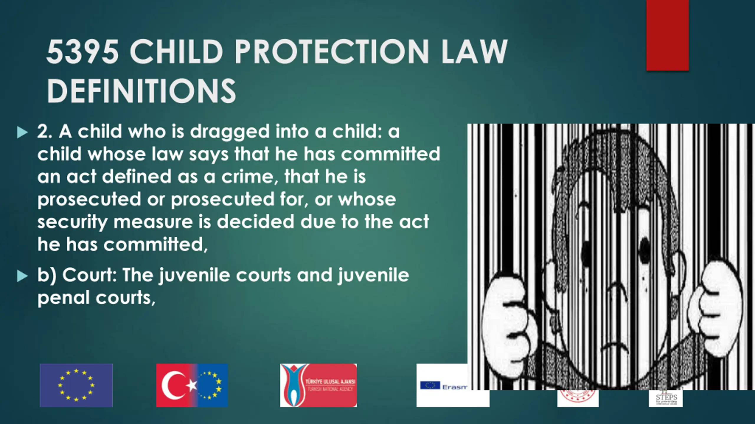 5395 CHILD PROTECTION LAW DEFINITIONS 2. A child who is dragged into a child: a child whose law says that he has committed an act defined as a crime, that he is prosecuted or prosecuted for, or whose security measure is decided due to the act he has committed, b) Court: The juvenile courts and juvenile penal courts,