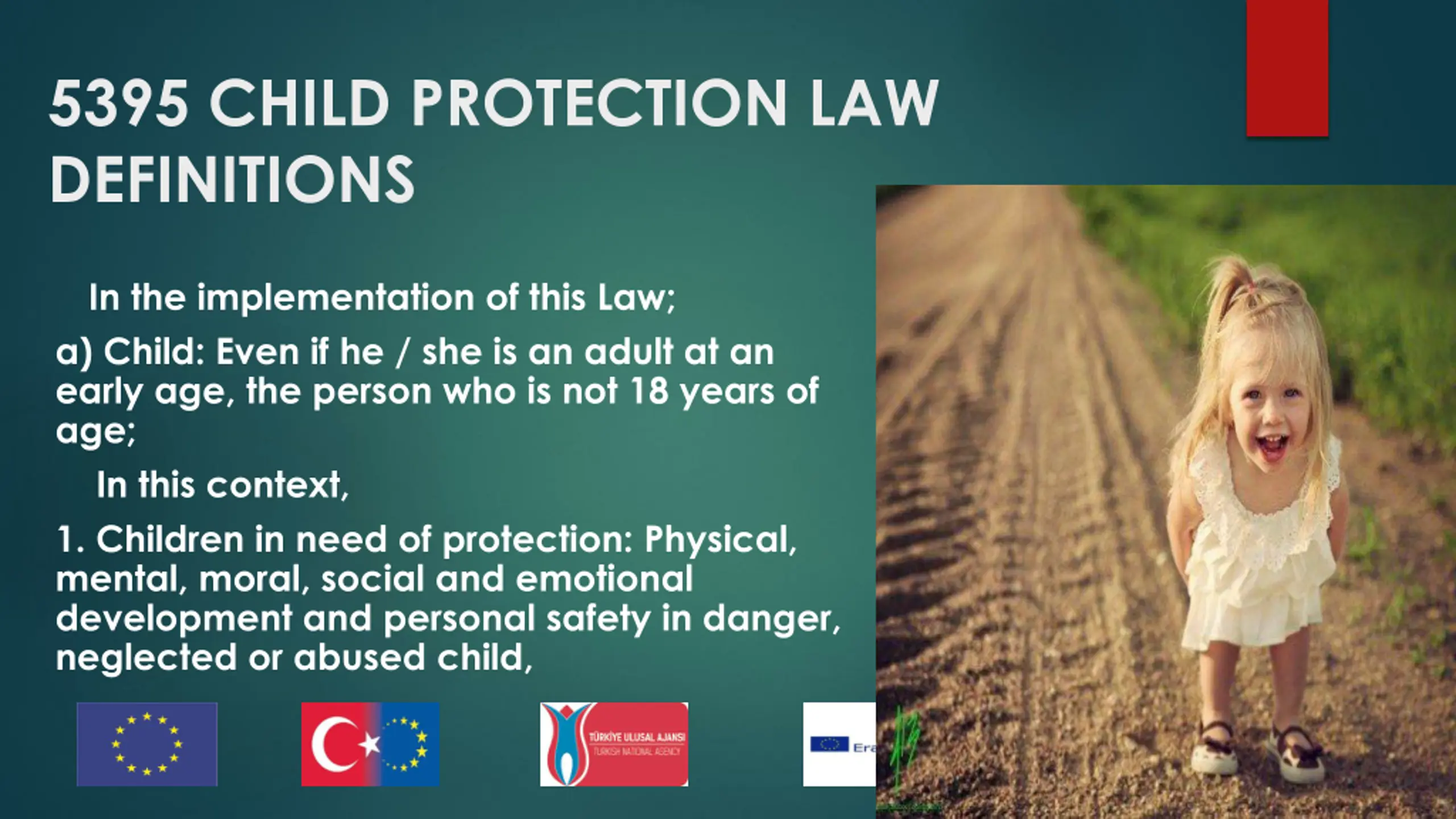 5395 CHILD PROTECTION LAW DEFINITIONS In the implementation of this Law; a) Child: Even if he / she is an adult at an early age, the person who is not 18 years of age; In this context, 1. Children in need of protection: Physical, mental, moral, social and emotional development and personal safety in danger, neglected or abused child,