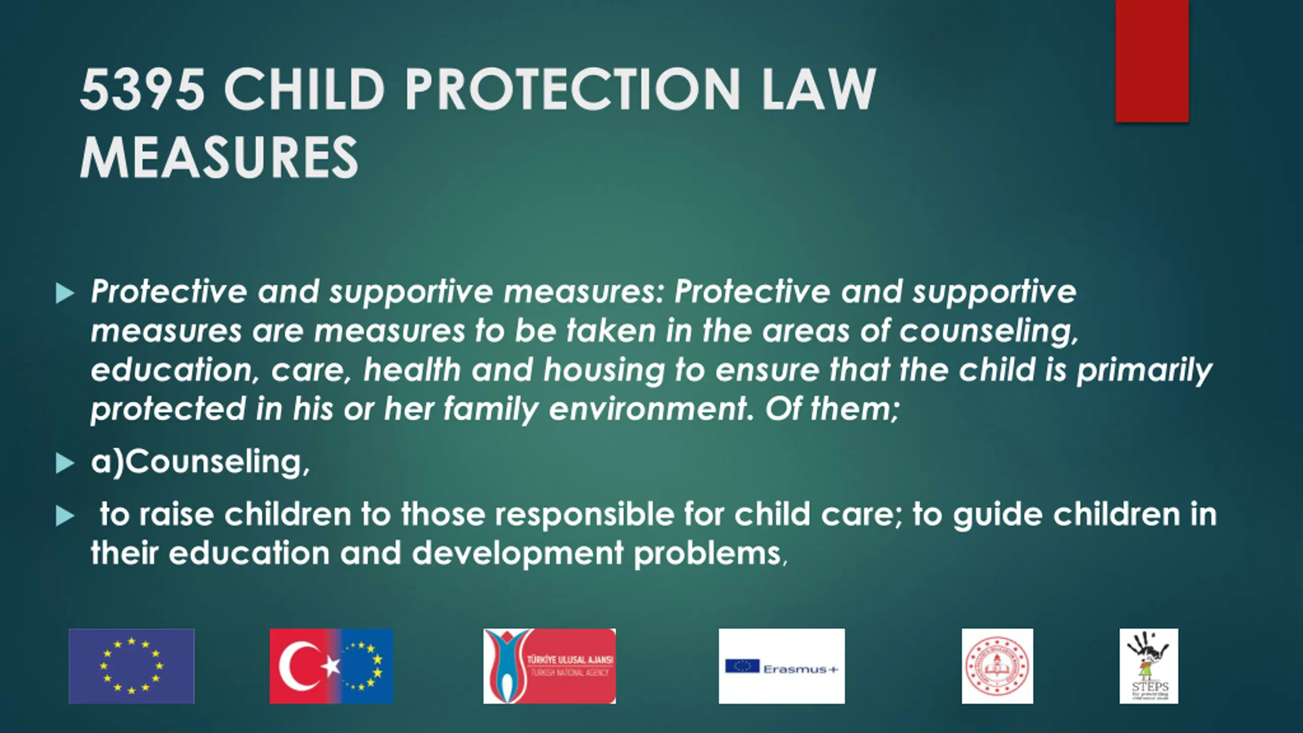 5395 CHILD PROTECTION LAW MEASURES Protective and supportive measures: Protective and supportive measures are measures to be taken in the areas of counseling, education, care, health and housing to ensure that the child is primarily protected in his or her family environment. Of them; a)Counseling, to raise children to those responsible for child care; to guide children in their education and development problems,