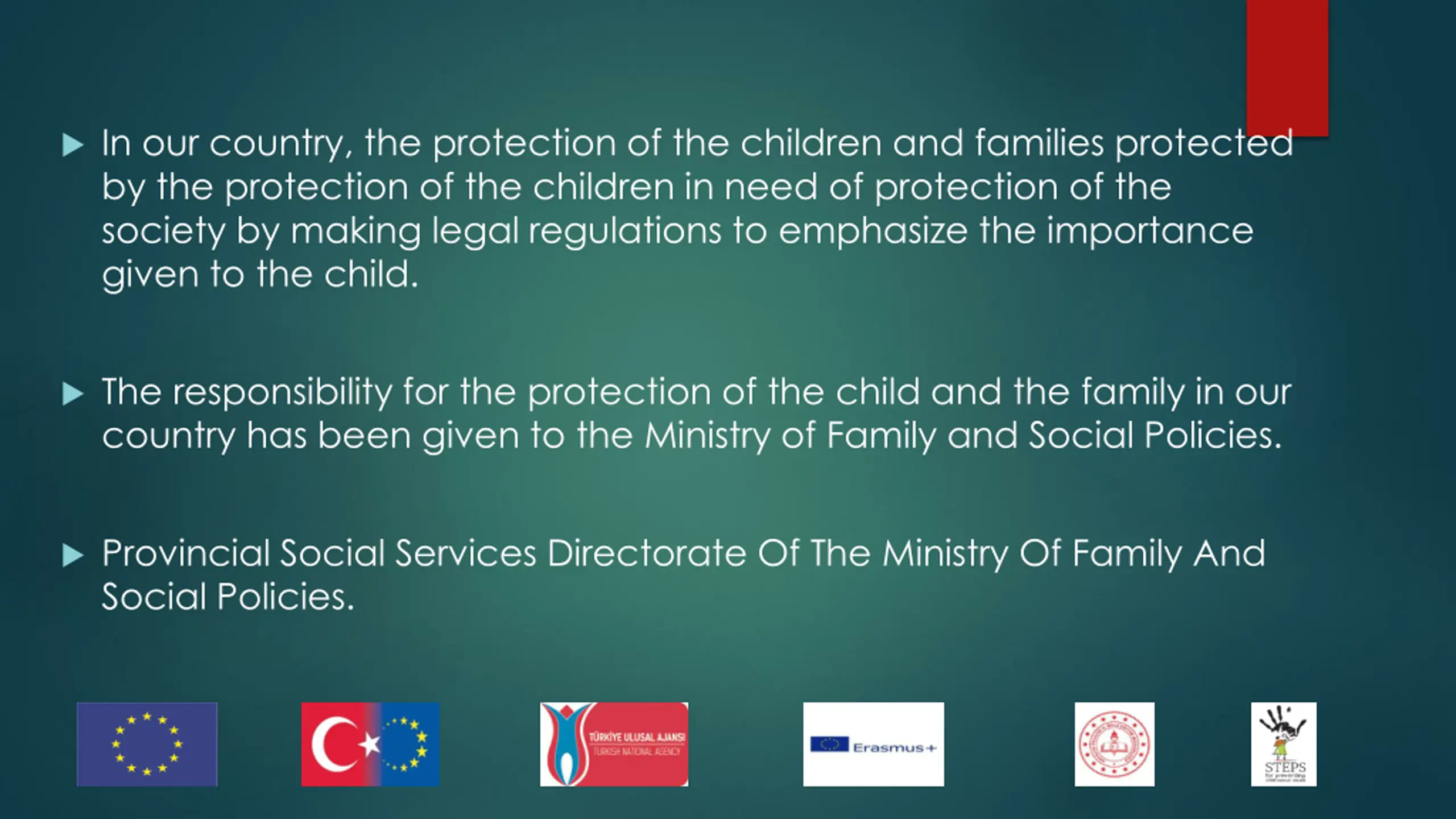 In our country, the protection of the children and families protected by the protection of the children in need of protection of the society by making legal regulations to emphasize the importance given to the child. The responsibility for the protection of the child and the family in our country has been given to the Ministry of Family and Social Policies. Provincial Social Services Directorate Of The Ministry Of Family And Social Policies.