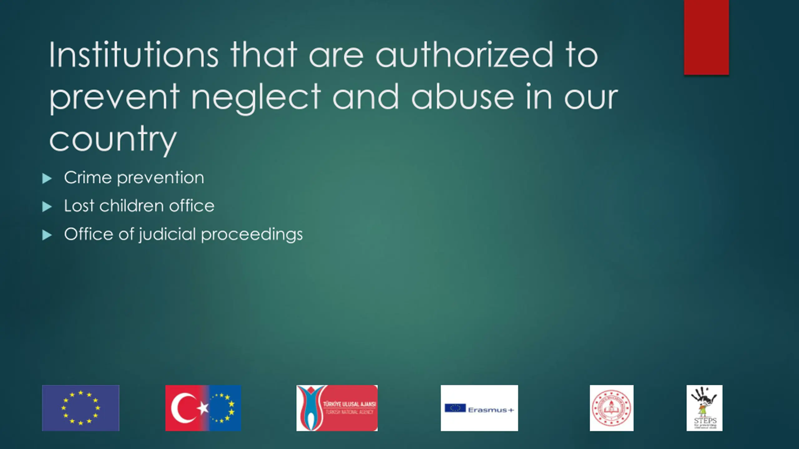 Institutions that are authorized to prevent neglect and abuse in our country Crime prevention Lost children office Office of judicial proceedings